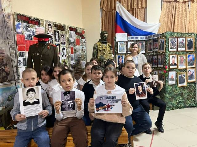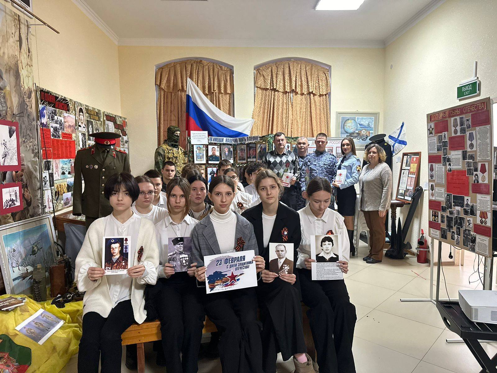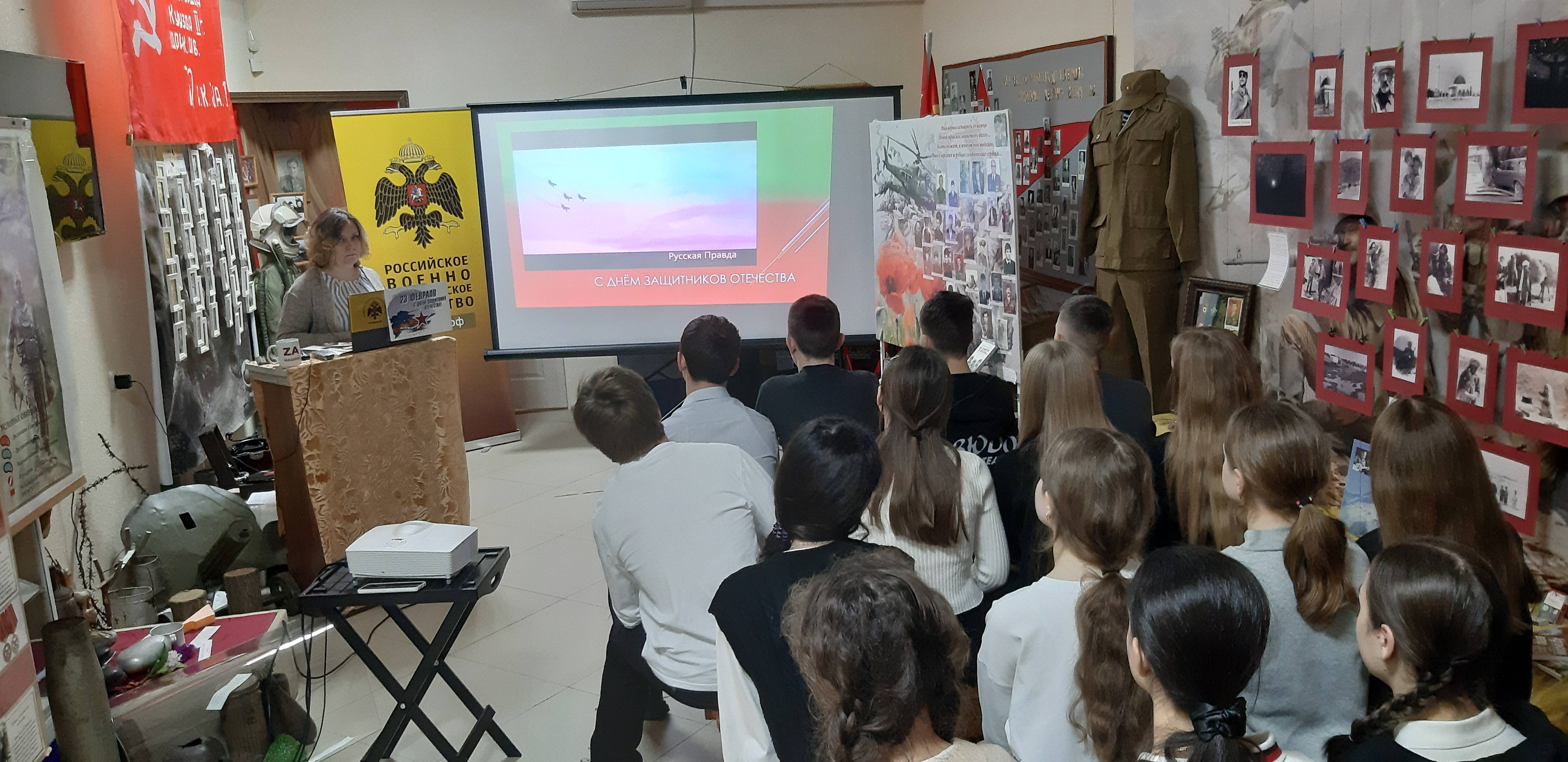 Скрипникова Л.А., экскурсовод музея, член РО РВИО СК, рассказала школьникам об истории праздника, о земляках-участниках Великой Отечественной войны, о ветеранах боевых действий и участниках специальной военной операции (СВО). Мероприятие сопровождалось показом тематических видеороликов и выставки «Достойные сыны Отечества», приуроченной к предстоящему празднику.