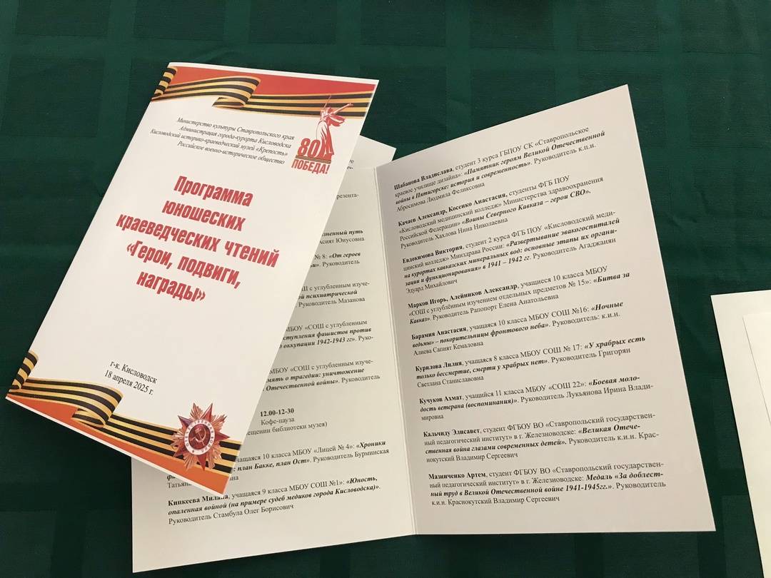 18 апреля 2025 года в Кисловодском историко-краеведческом музее «Крепость» (директор – Лузин С.С., член Местного отделения Ставропольского регионального отделения Российского военно-исторического общества (РО РВИО СК) в городе-курорте Кисловодске (председатель – Грачев С.Н.)) состоялись юношеские краеведческие чтения «Герои, подвиги, награды».