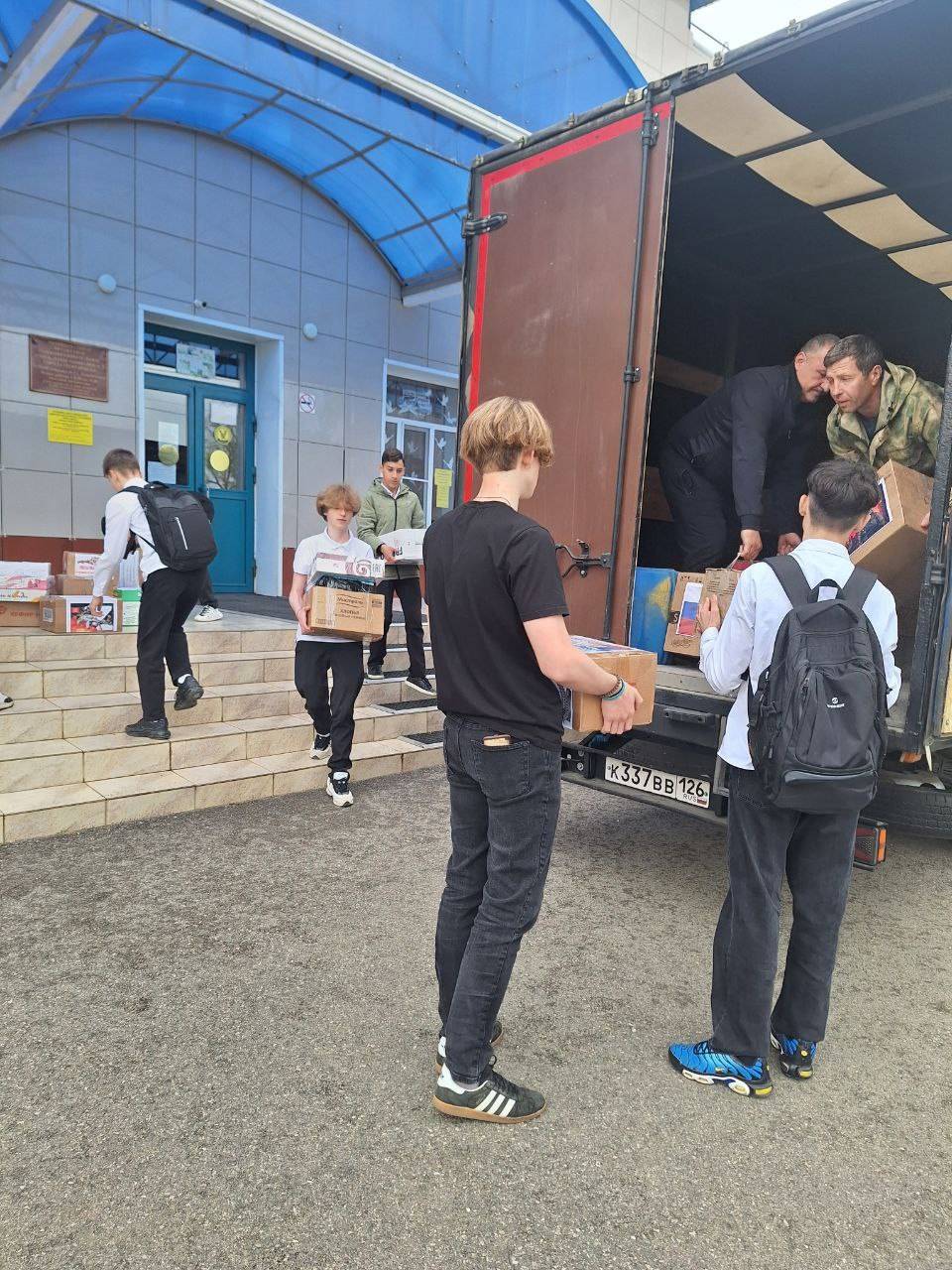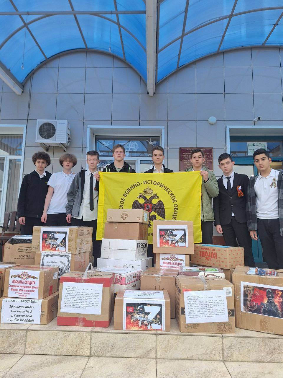 Гимназисты написали поздравительные письма ко Дню Победы, собрали продуктовые наборы и предметы первой необходимости, а ученики 10Б класса записали видеообращение с пожеланиями для военнослужащих. К инициативе присоединились учащиеся и других образовательных учреждений, а также предприниматели и жители округа. Собранный груз был доставлен в Херсонскую область А.М. Стрельниковым, председателем Думы Георгиевского муниципального округа, членом РО РВИО СК.