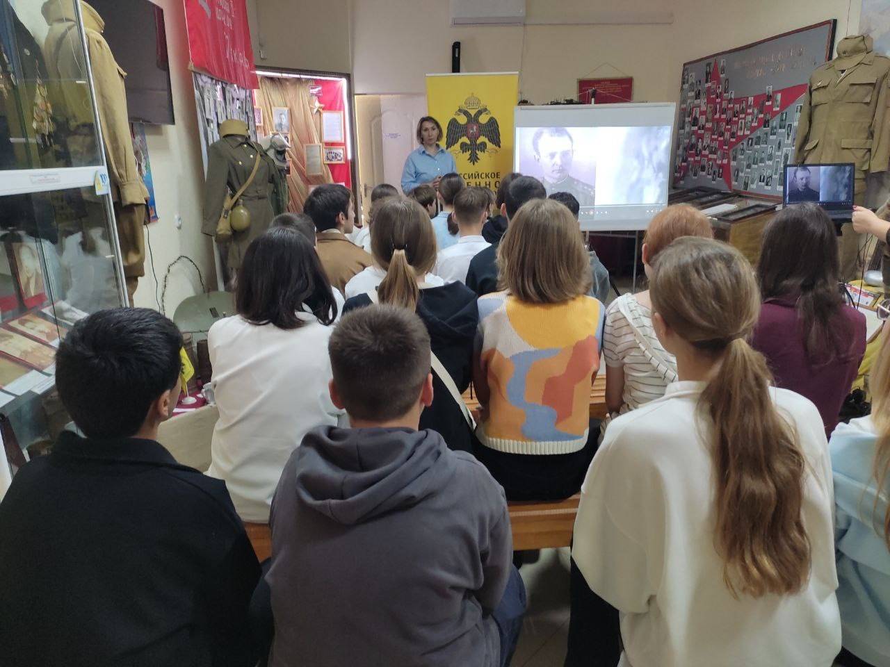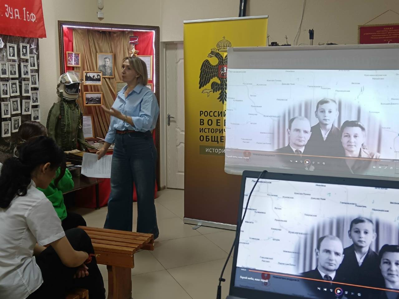 Сотрудники музея Герасимова М.Ф. и Скрипникова Л.А., члены РО РВИО СК, не только познакомили учащихся с основными вехами жизни героя и осветили факты личной биографии Михаила Владимирова, но и рассказали о его подвигах, наградах, а так же о том, как сложилась его жизнь после войны. Тематическая экспозиция содержит фотографии и документы из личного архива Михаила Григорьевича и его семьи, его воспоминания и личные вещи, переданные сыном Михаила Григорьевича. В ходе экскурсии учащимся демонстрировались видеозарисовки на тему военных будней, а так же видеоколлаж, где отражены боевые маршруты их земляка-Героя. Это позволило детям окунуться в атмосферу героических дней той эпохи.