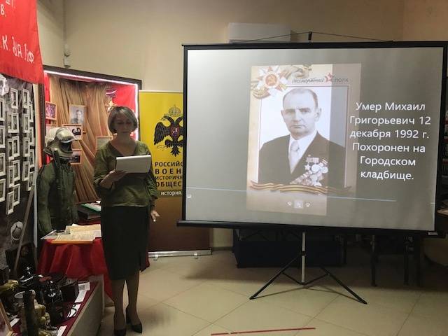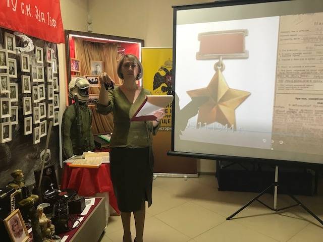 Герасимова М.Ф. и Скрипникова Л.А. продемонстрировали тематический видеоролик о жизненном пути Героя, рассказали о его боевых подвигах на основе фотографий и наградных документов, вкладе в патриотическое воспитание молодежи г. Новоалександровска в послевоенные годы.