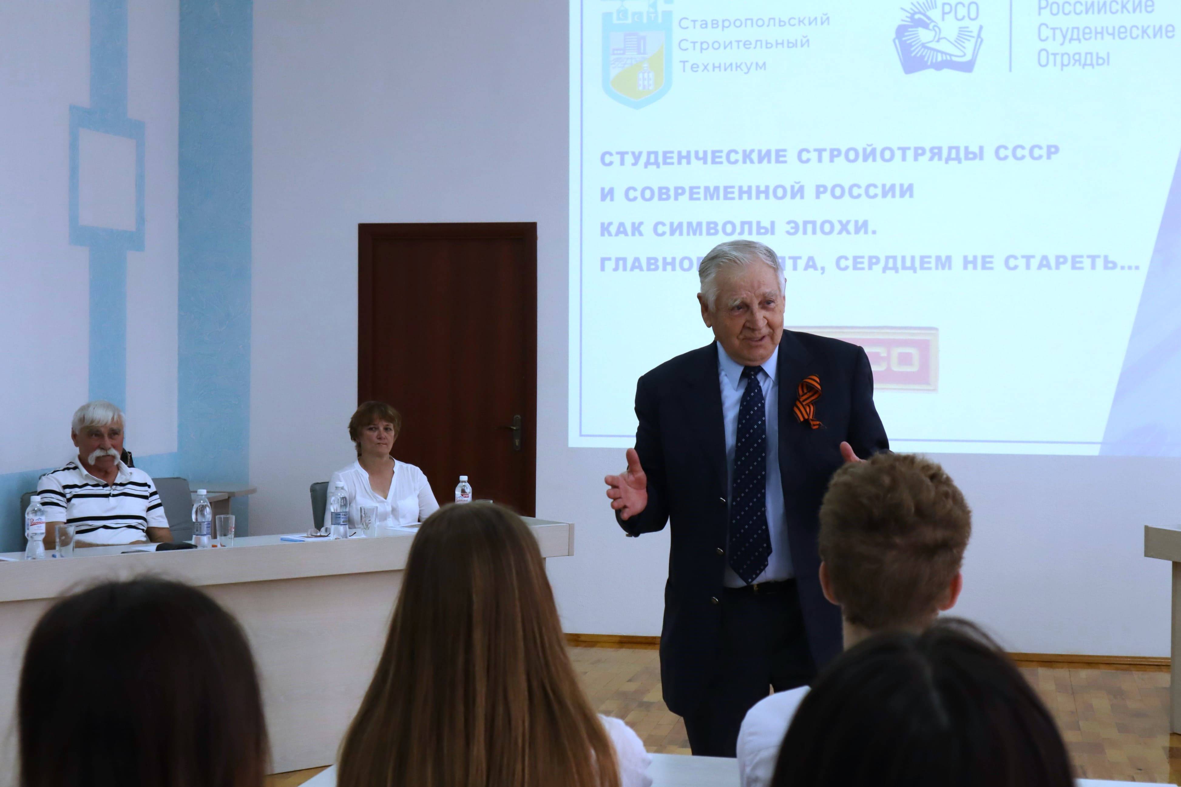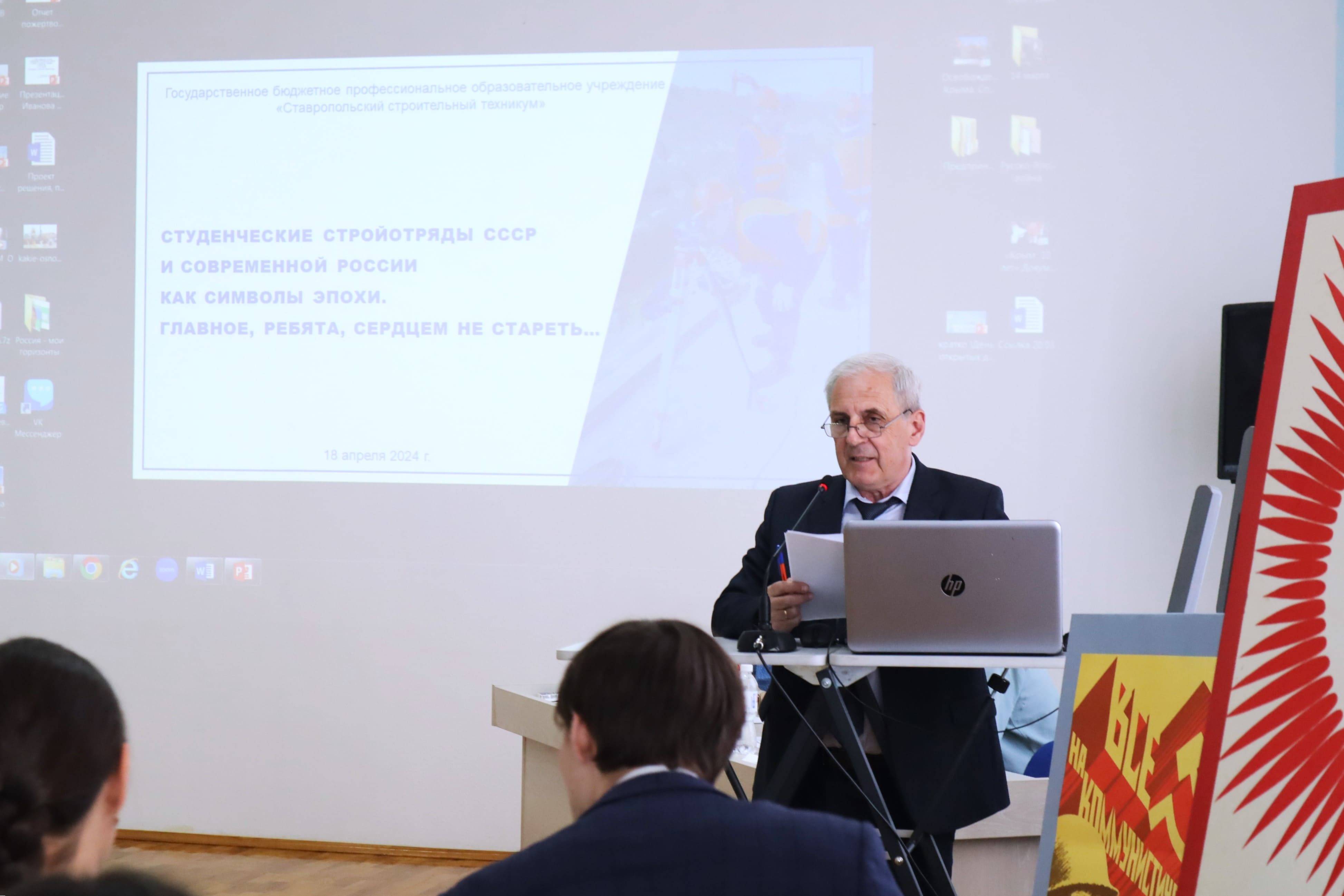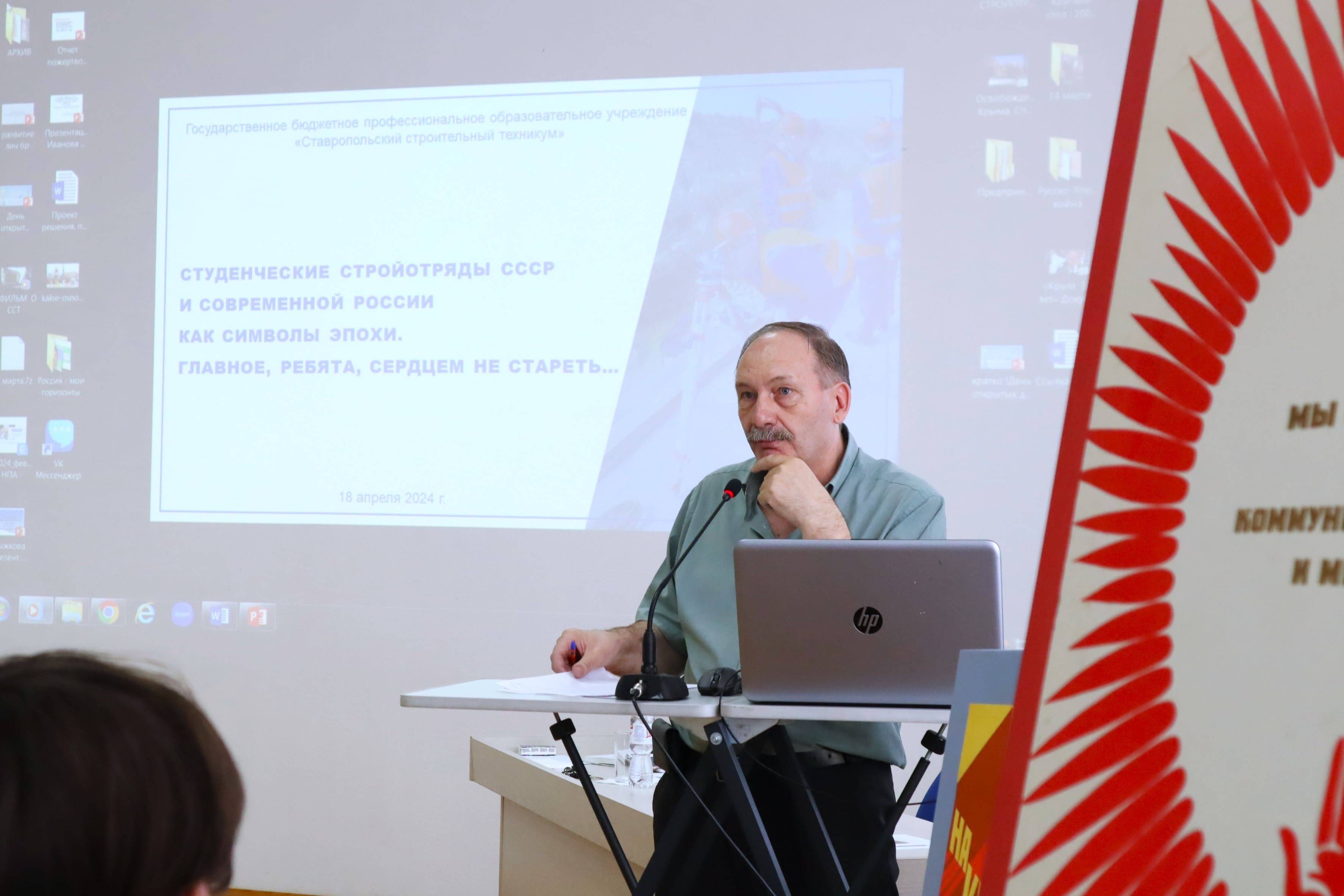 18 апреля 2024 года на базе Ставропольского строительного техникума (ССТ) состоялось заседание краеведческого кружка «Следопыт» в формате круглого стола «Студенческие отряды СССР и современной России как символы эпохи. Главное ребята, сердцем не стареть…». Мероприятие приурочено к 80-летию образования ССТ (1944-1924 гг.) и 65-летию Российского движения студенческих отрядов (1959-1924 гг.).
