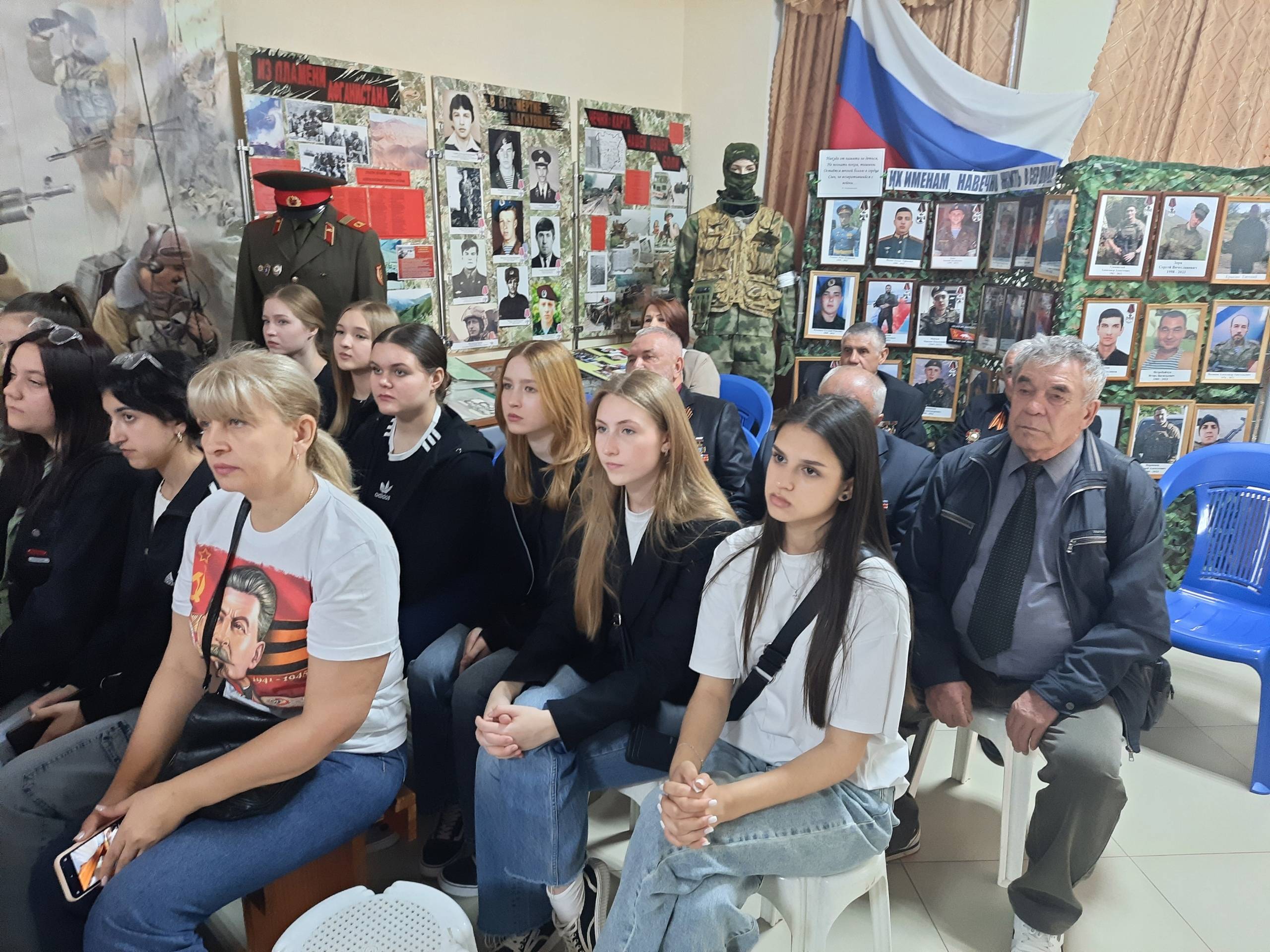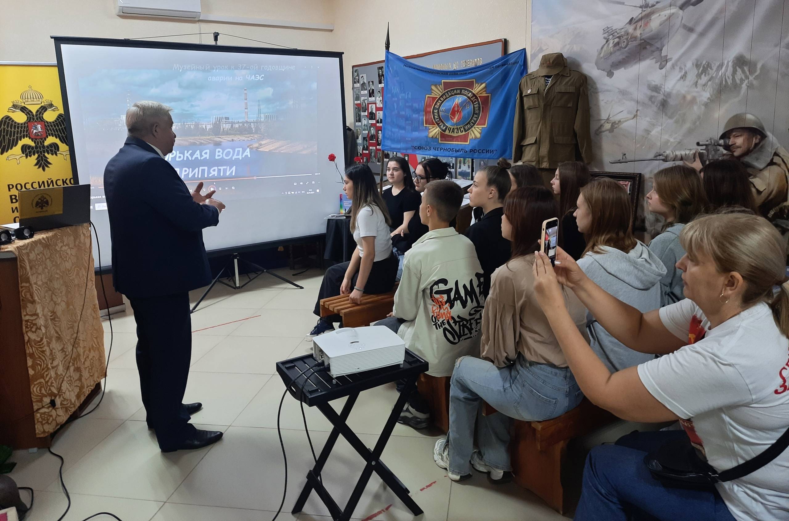 Герасимова М.Ф., сотрудник музея, активист РО РВИО СК, рассказала школьникам о событиях 26 апреля 1986 года, показала тематические видеоролики. Были продемонстрированы приборы, которыми пользовались ликвидаторы, личные документы земляков-«чернобыльцев» и их фотографии. Участники ликвидации последствий катастрофы поделились своими воспоминания о событии.