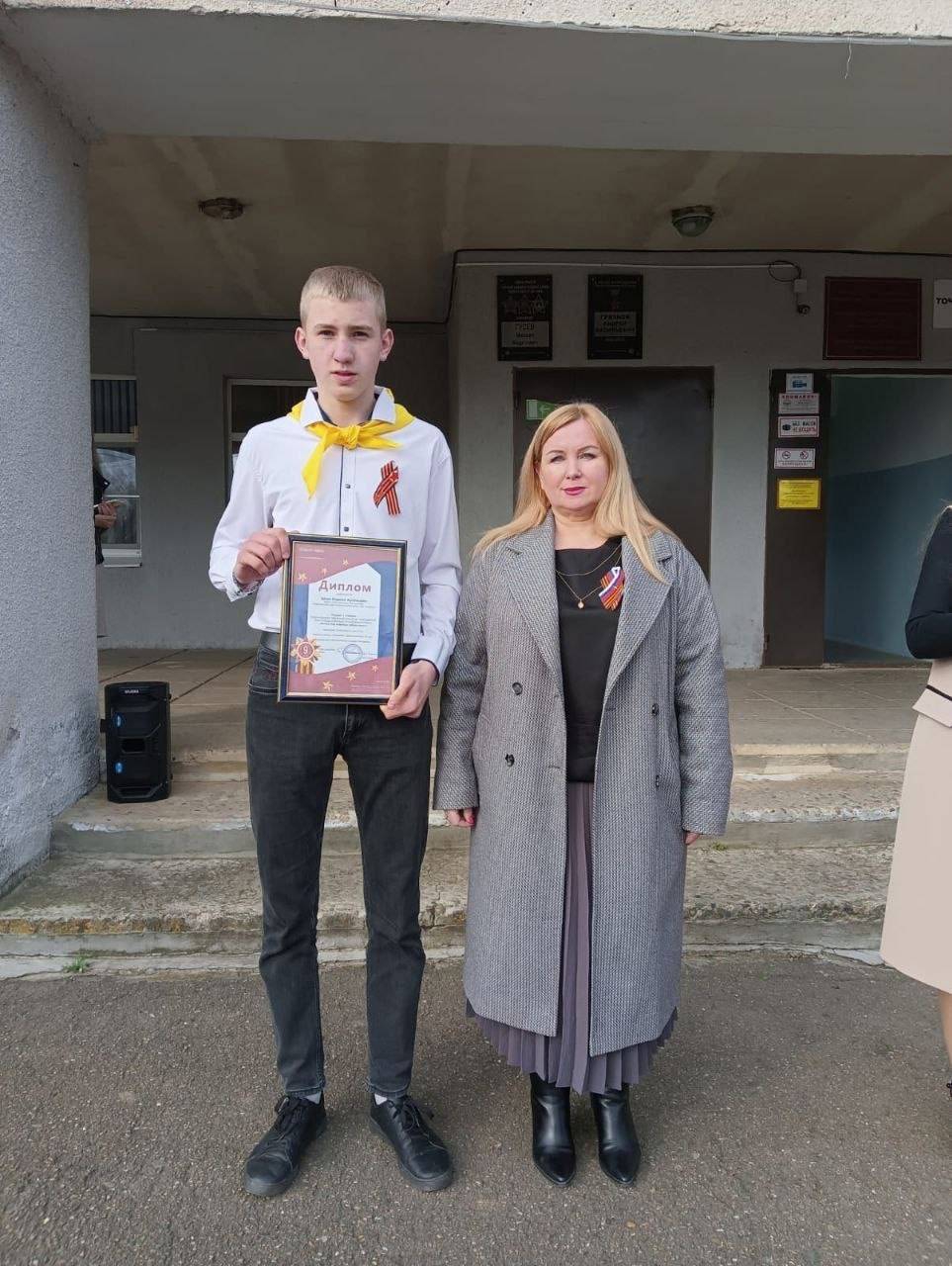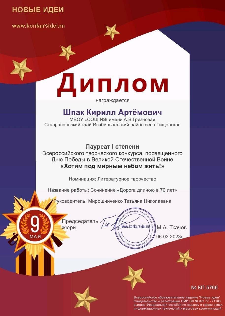 Ученик 8 класса МБОУ СОШ №8 имени А. В. Грязнова с. Тищенского (директор – Князева С.С., член РО РВИО СК), член клуба «Юный патриот» Кирилл Шпак принял участие во Всероссийском творческом конкурсе «Хотим под мирным небом жить», посвящённом Дню Победы в Великой Отечественной войне. Работа написана под руководством Мирошниченко Т.Н., учителя русского языка и литературы, руководителя школьного музея, члена Местного отделения РО РВИО СК в Изобильненском городском округе (председатель – Щендригин Н.И.). В номинации «Литературное творчество» школьник представил сочинение «Дорога длиною в 70 лет», в котором рассказал про своего прадеда, Нихаева Ивана Филипповича, героически погибшего 1 февраля 1945 года возле хутора Лейбас в Латвии. Спустя 70 лет благодаря знакомству в интернете с женщиной из Латвии, горсть земли с могилы прадеда была прислана в Россию и перезахоронена на местном кладбище. Память о своем родственнике свято хранится в семье школьника и передается из поколения в поколения.