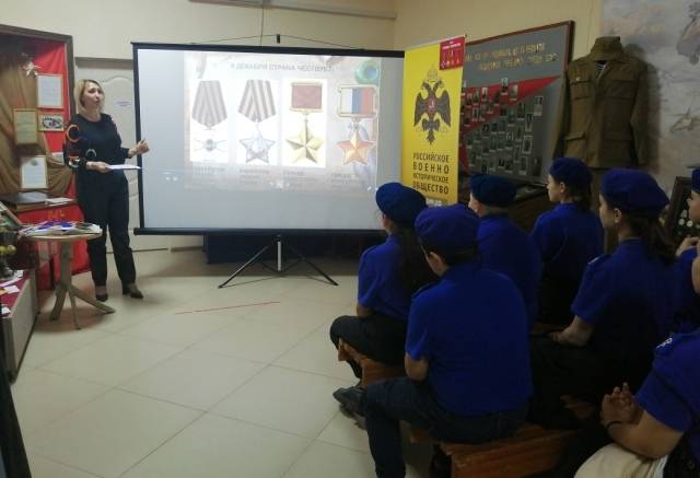 Герасимова М.Ф. рассказала школьникам об истории этого праздника, о людях, которых принято чествовать в этот памятный день – Героях Советского Союза, Героях Российской Федерации, кавалерах ордена Святого Георгия и ордена Славы. Особый разговор шёл о наших земляках, причастных к данному празднику. Среди них: полные кавалеры Знака отличия ордена Святого Георгия Я.А. Есин, И.П. Картавцев; Герой Советского Союза М.Г. Владимиров; полный кавалер ордена Славы И.М. Калиничев; Т.В. Данильчук, награждённый Знаком отличия Ордена Святого Георгия 3-й степени, и другие.