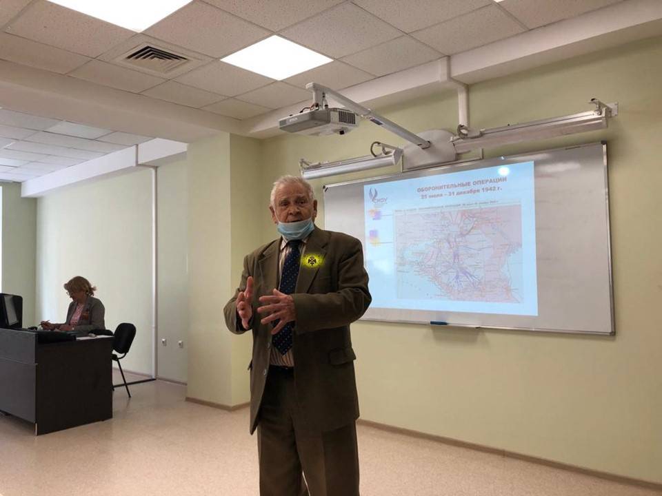 Судавцов Н.Д., д.и.н., Почетный профессор СКФУ, главный научный сотрудник отдела военной истории и патриотической работы Ставропольского государственного музея-заповедника (СГМЗ), один из учредителей РО РВИО СК, представил доклад на тему «Битва за Кавказ - одна из самых продолжительных битв Великой Отечественной и Второй мировой войн». Он рассказал о ходе военных действий на Кавказе, о вклад народов Кавказа в разгром фашизма, о помощи населения фронту.