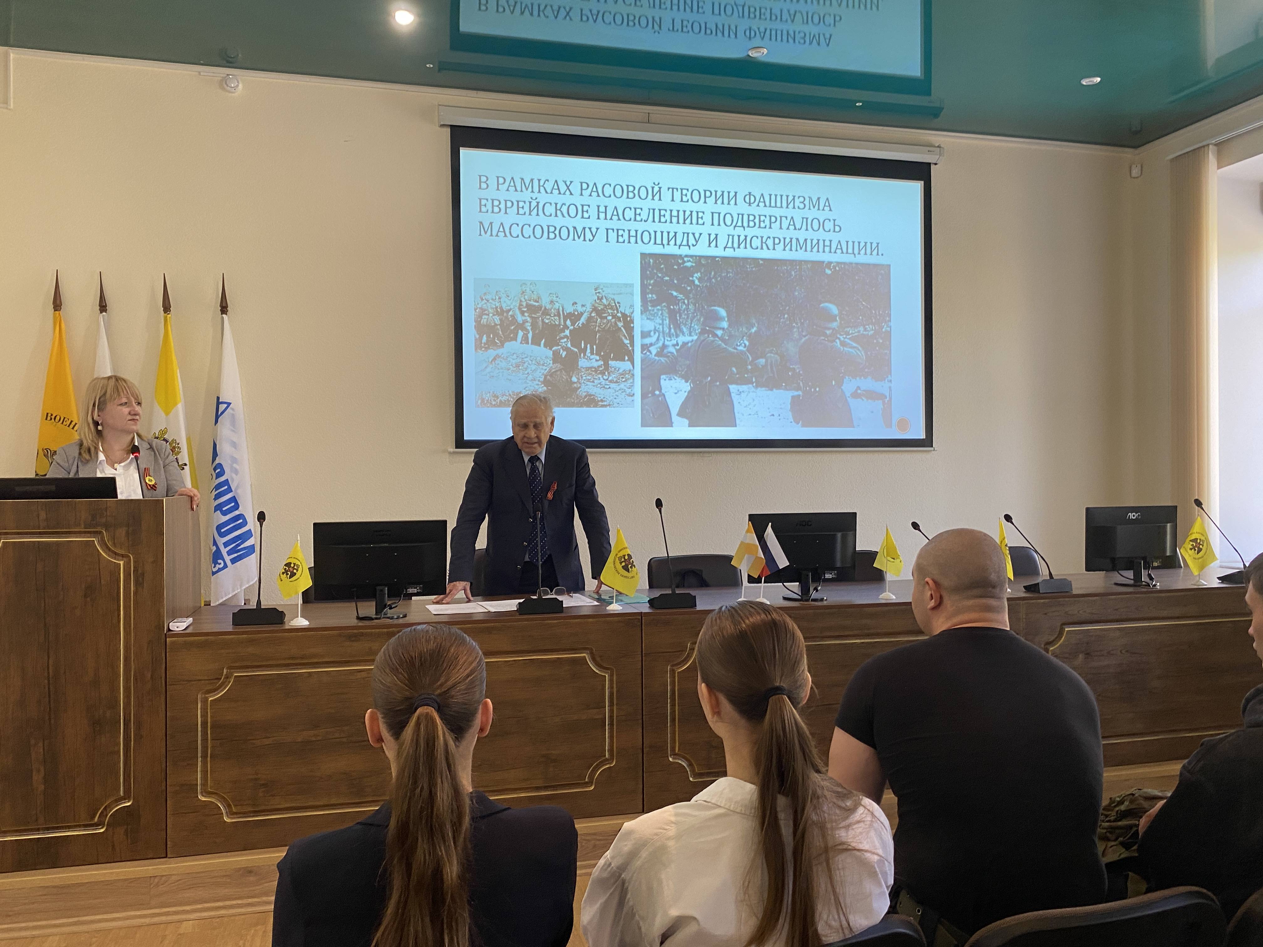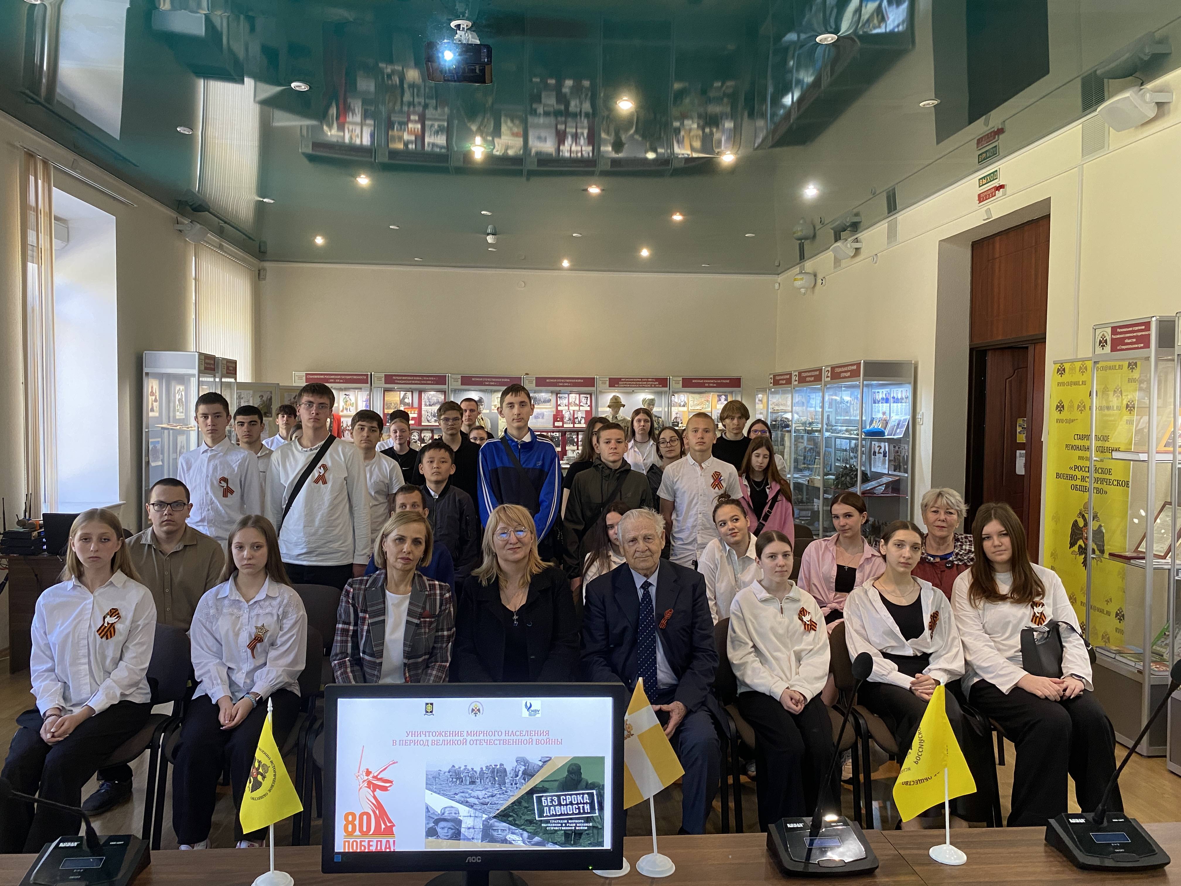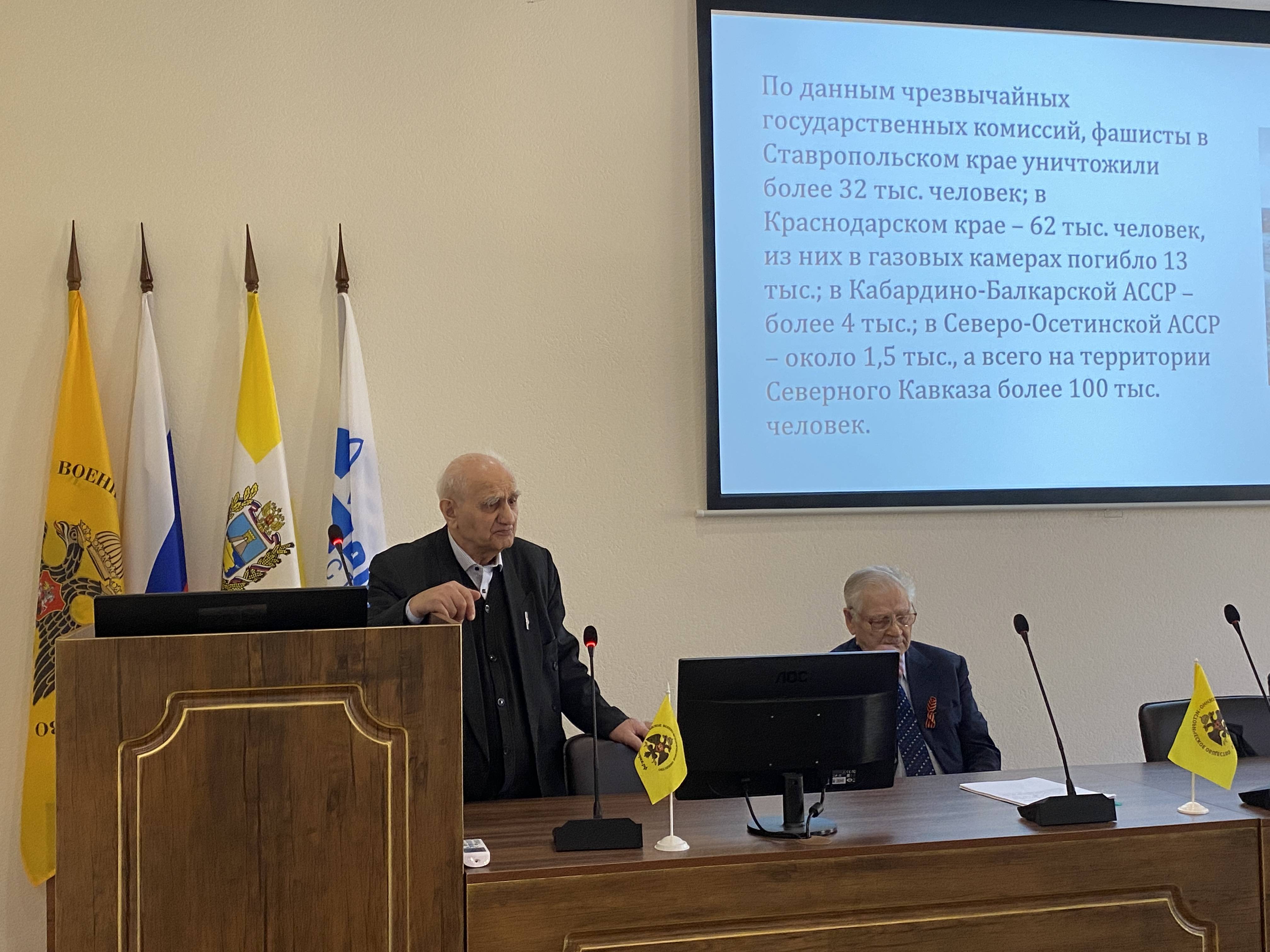 Состоялся просмотр фрагментов документальных фильмов «Обыкновенный фашизм» и «Великая Отечественная. Неизвестная война». Вместе с историческими экспертами Судавцовым Н.Д., д.и.н., Почетным профессором Северо-Кавказского федерального университета (СКФУ), главным научным сотрудником отдела военной истории и патриотической работы СГМЗ, членом-учредителем РО РВИО СК, и Стрекаловой Е.Н., к.и.н., доцентом кафедры истории России СКФУ, старшим научным сотрудником отдела военной истории и патриотической работы СГМЗ, членом РО РВИО СК, школьники обсудили вопросы значения сохранения исторической памяти о геноциде советского народа немецко-фашистскими захватчиками. Участники мероприятия смогли больше узнать о преступлениях оккупантов на территории Ставропольского края. Своими воспоминаниями со школьниками поделился дитя войны Я.В. Новахов.