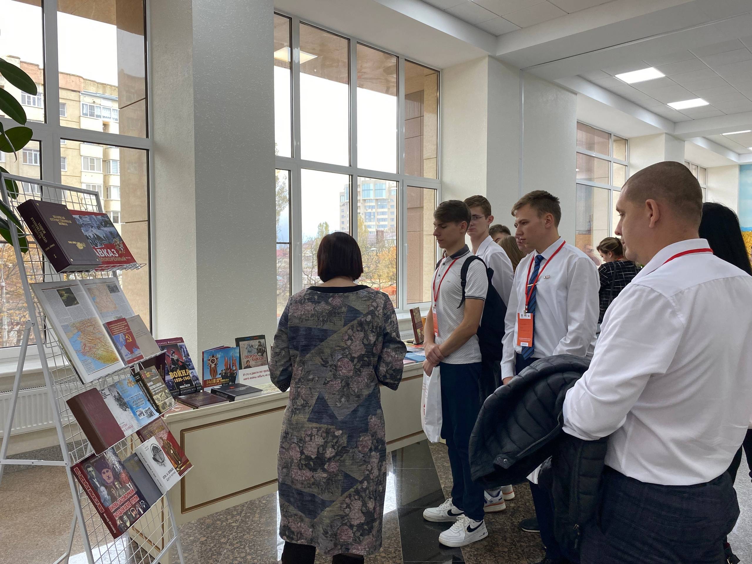 В завершении работы площадки участники Форума под руководством Гаранжи Н.А., главного библиографа отдела краеведческой литературы и библиографии ГБУК «Ставропольская краевая универсальная научная библиотека им. М.Ю. Лермонтова», смогли ознакомиться с книжной выставкой «Кавказ непокоренный», на которой среди множества книг, посвященных Битве за Кавказ, были издания, подготовленные РО РВИО СК.
