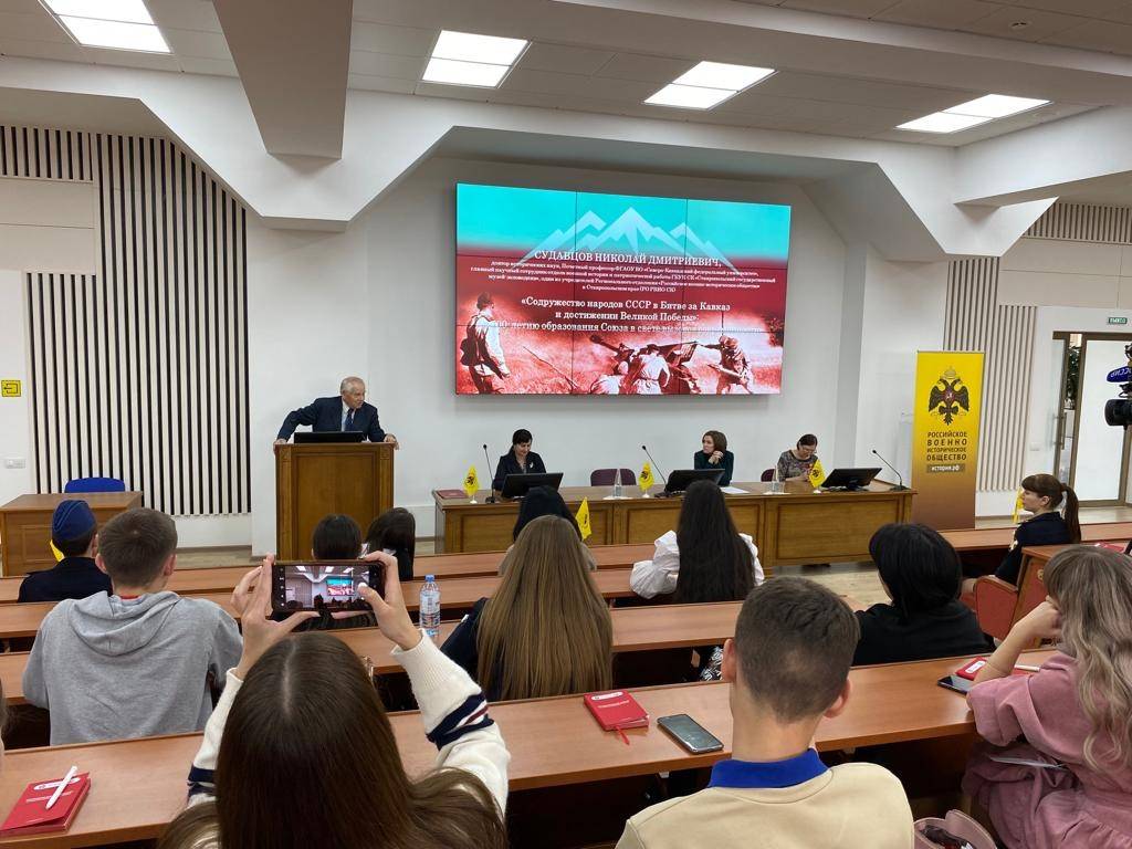 Судавцов Н.Д. рассказал о вкладе народов Кавказа в дело Великой Победы, о значимости дружбы народов, сложившейся в СССР, которая постоянно подвергается попыткам фальсификации. Особое внимание он обратил на роль Битвы за Кавказ в коренном переломе Великой Отечественной войны.