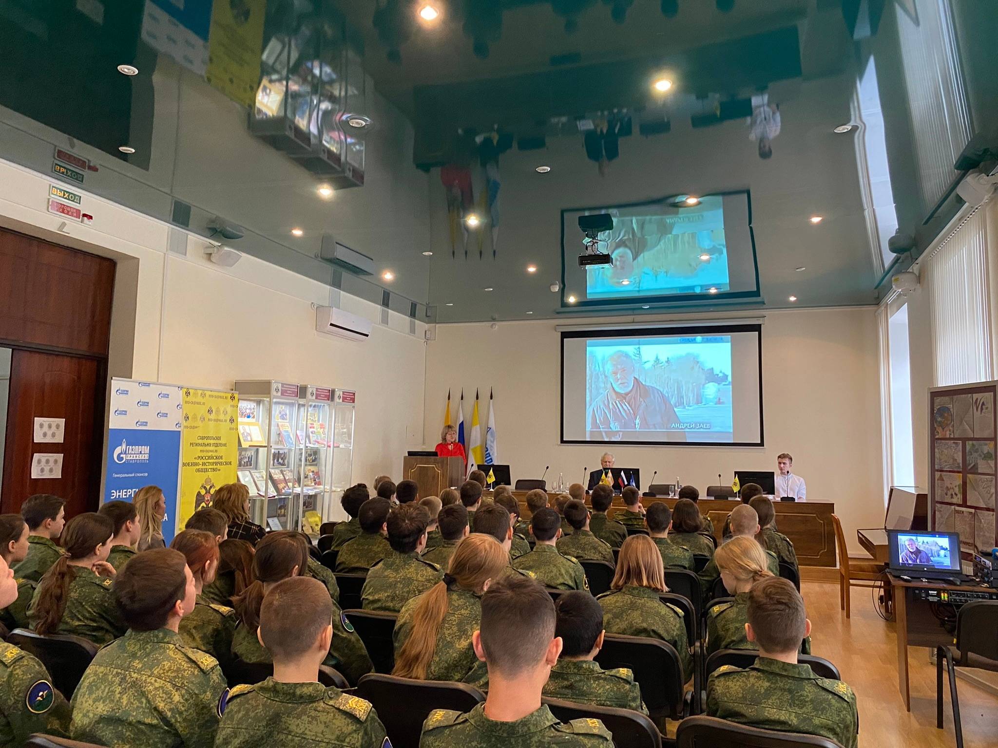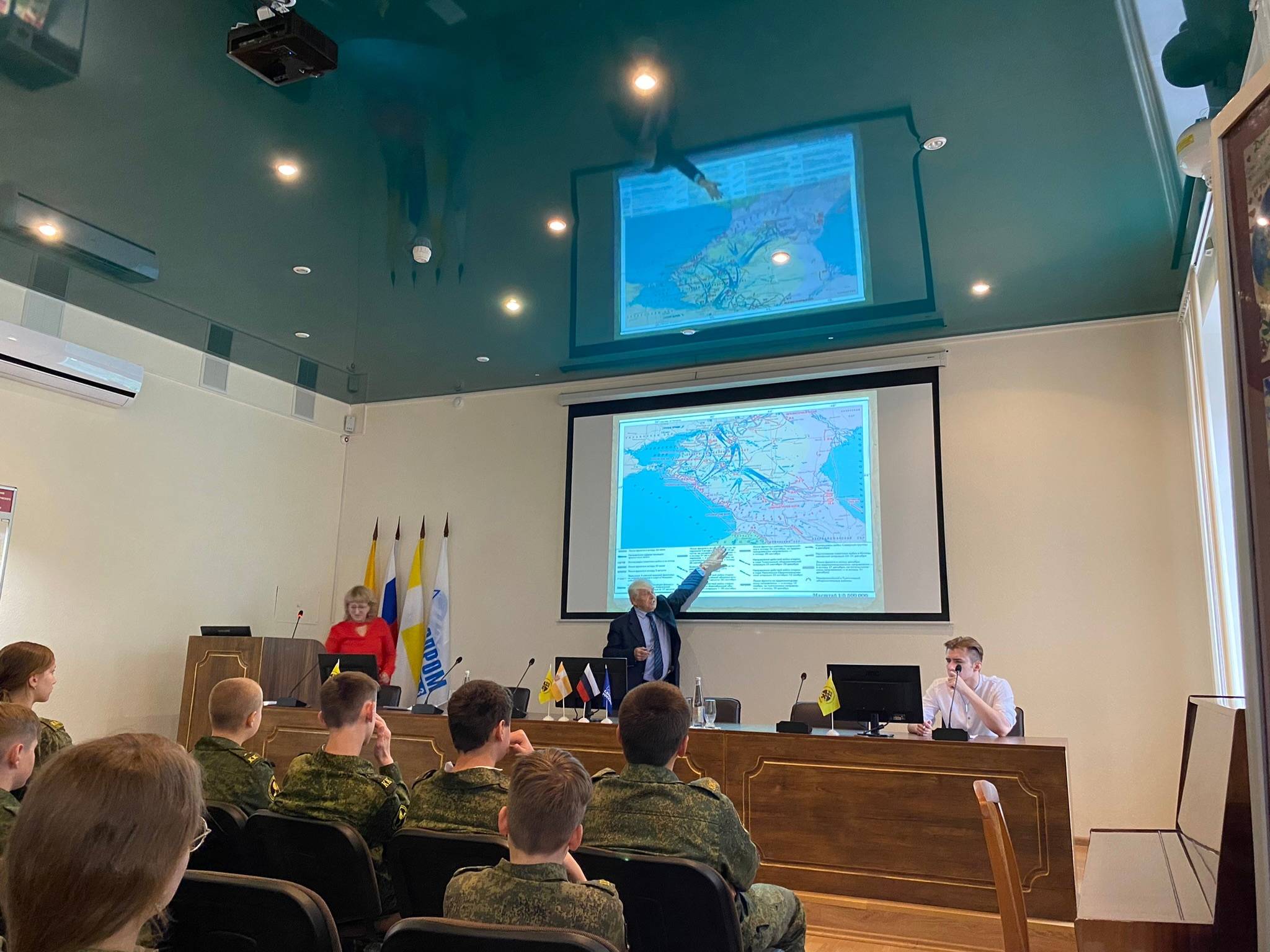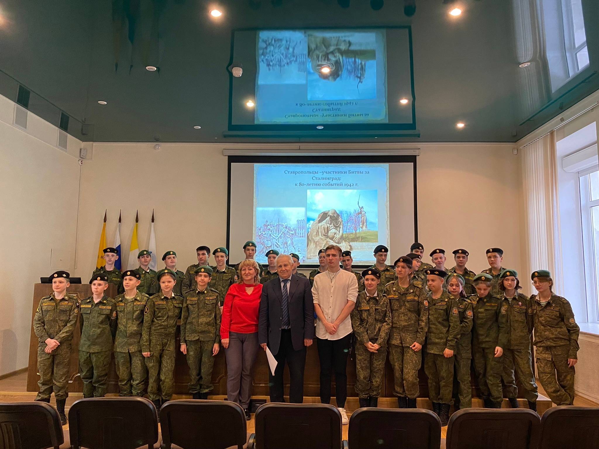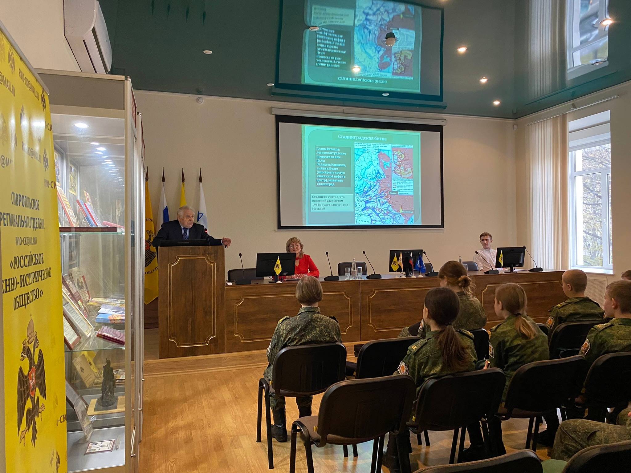Судавцов Н.Д., д.и.н., Почетный профессор Северо-Кавказского федерального университета (СКФУ), главный научный сотрудник отдела военной истории и патриотической работы СГМЗ, один из учредителей РО РВИО СК, рассказал учащимся о планах Гитлера по завоеванию Кавказа и Сталинграда, о взаимосвязи двух битв, о значении победы в них для коренного перелома в ходе Великой Отечественной войны.