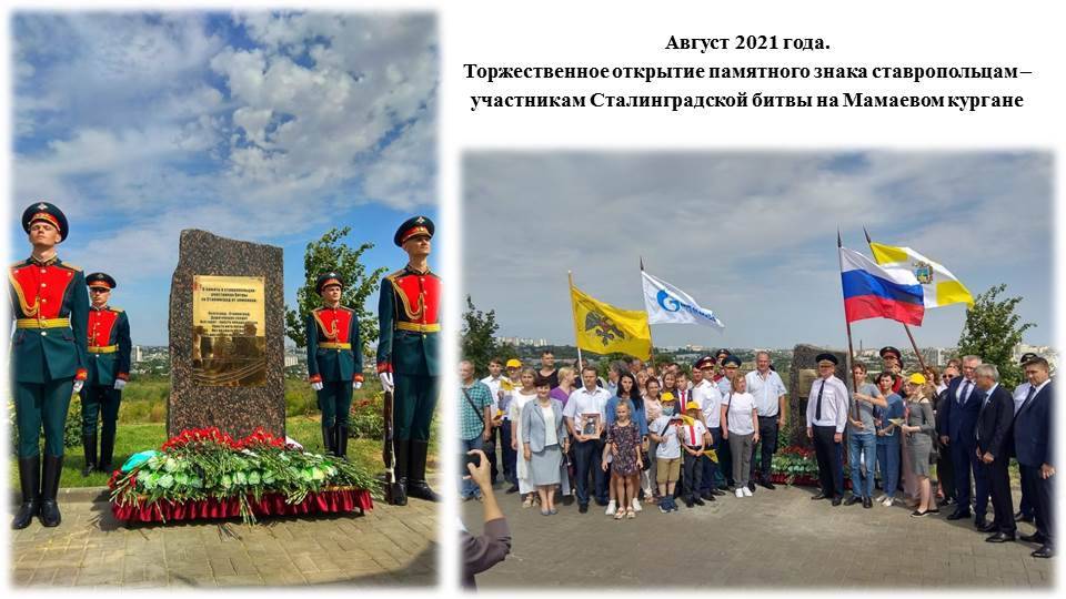 В августе 2021 года на средства Регионального отделения Российского военно-исторического общества в Ставропольском крае (РО РВИО СК) на Мамаевом кургане в городе-герое Волгограде был установлен памятный знак ставропольцам – участникам Сталинградской битвы.