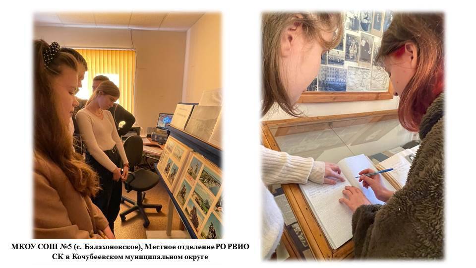 Всегда помнят о величайшем сражении под Сталинградом и на территории Ставрополья. Ставропольское отделение РВИО ежегодно проводит массовые акции и мероприятия в честь победного завершения Сталинградской битвы. Местное отделение РО РВИО СК в Кочубеевском муниципальном округе (пред. С.Н. Котов) провело музейный урок в с. Балахоновском (Шульгина И.В., член РО РВИО СК, учитель истории, зам. директора МКОУ СОШ №5), посвященный разгрому немецко-фашистских войск под Сталинградом. Участники встречи познакомились с воспоминаниями участников битвы – земляков, в т.ч. А.М. Клещуновой.