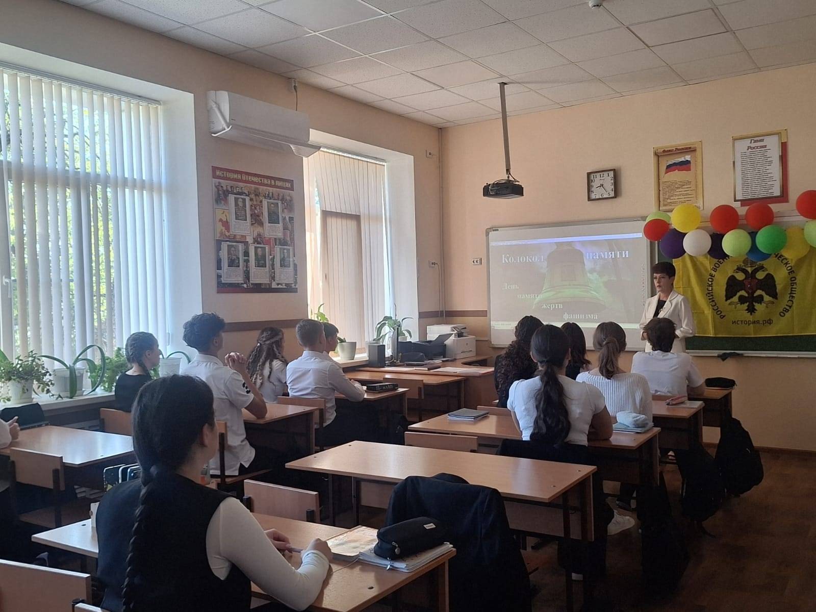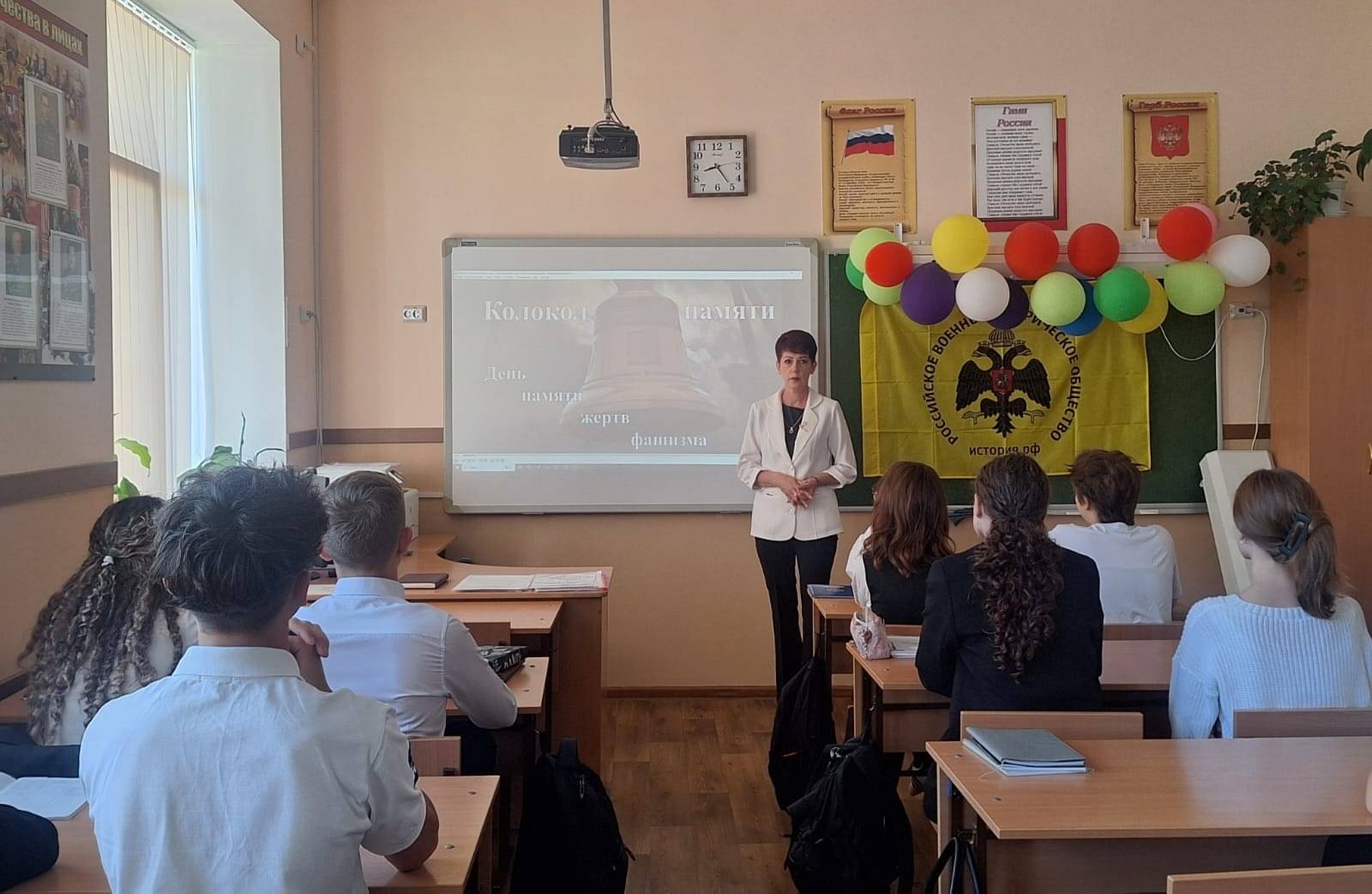 В МБОУ гимназии №2 г. Георгиевска учитель истории Алексина Е.Ю., председатель Местного отделения РО РВИО СК в Георгиевском муниципальном округе, провела для старшеклассников мероприятие «Колокол памяти». Его главной целью стало напоминание молодому поколению о страшной цене, которую заплатили народы мира за победу над фашизмом.