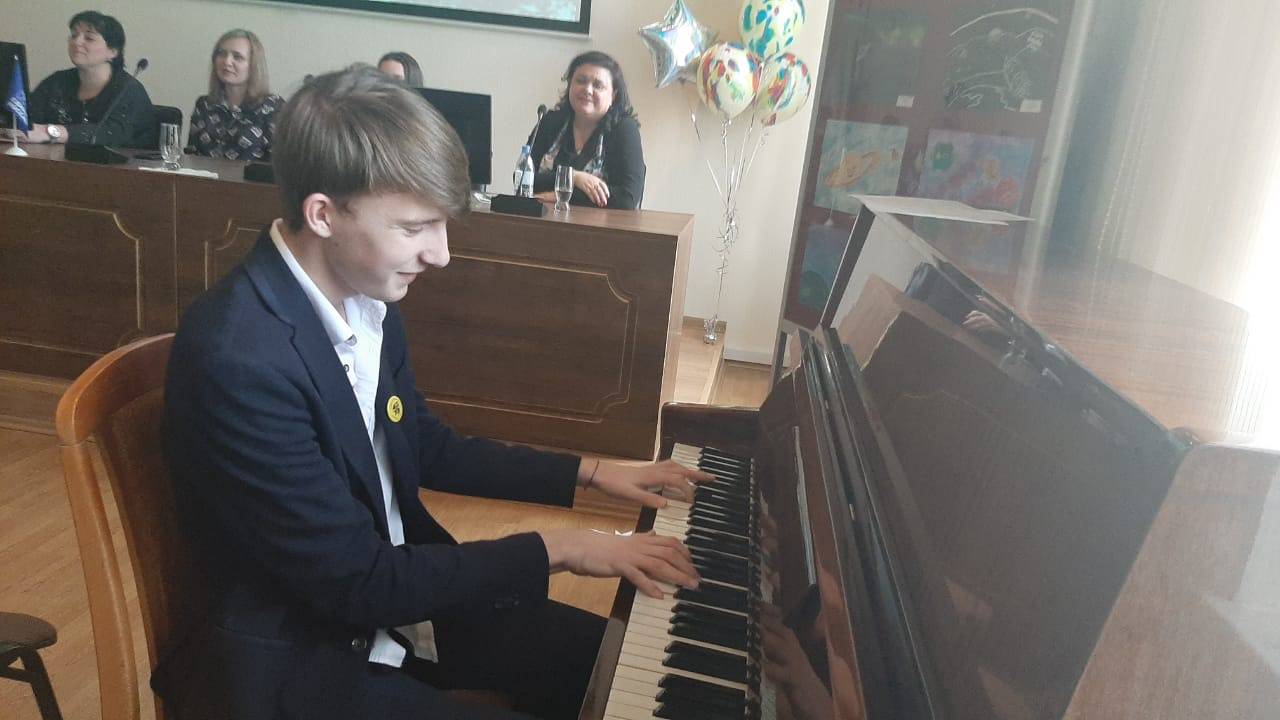 Музыкальная страница урока представляла хоровое исполнение песни «Земля в иллюминаторе», аккомпанировал на пианино учащийся 9 «В» класса МБОУ СОШ №7 г. Ставрополя Холодков Владимир.