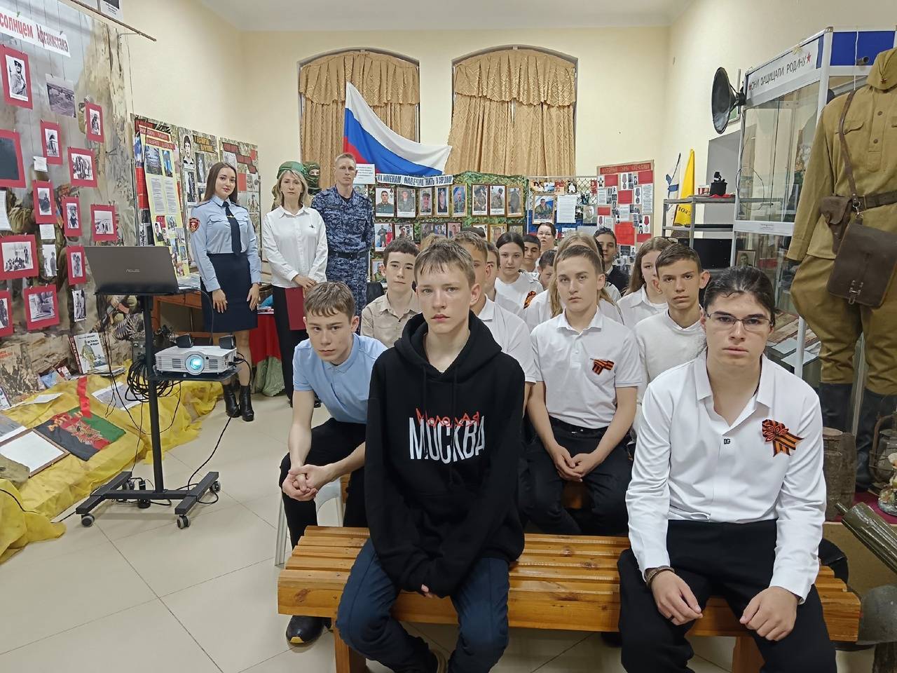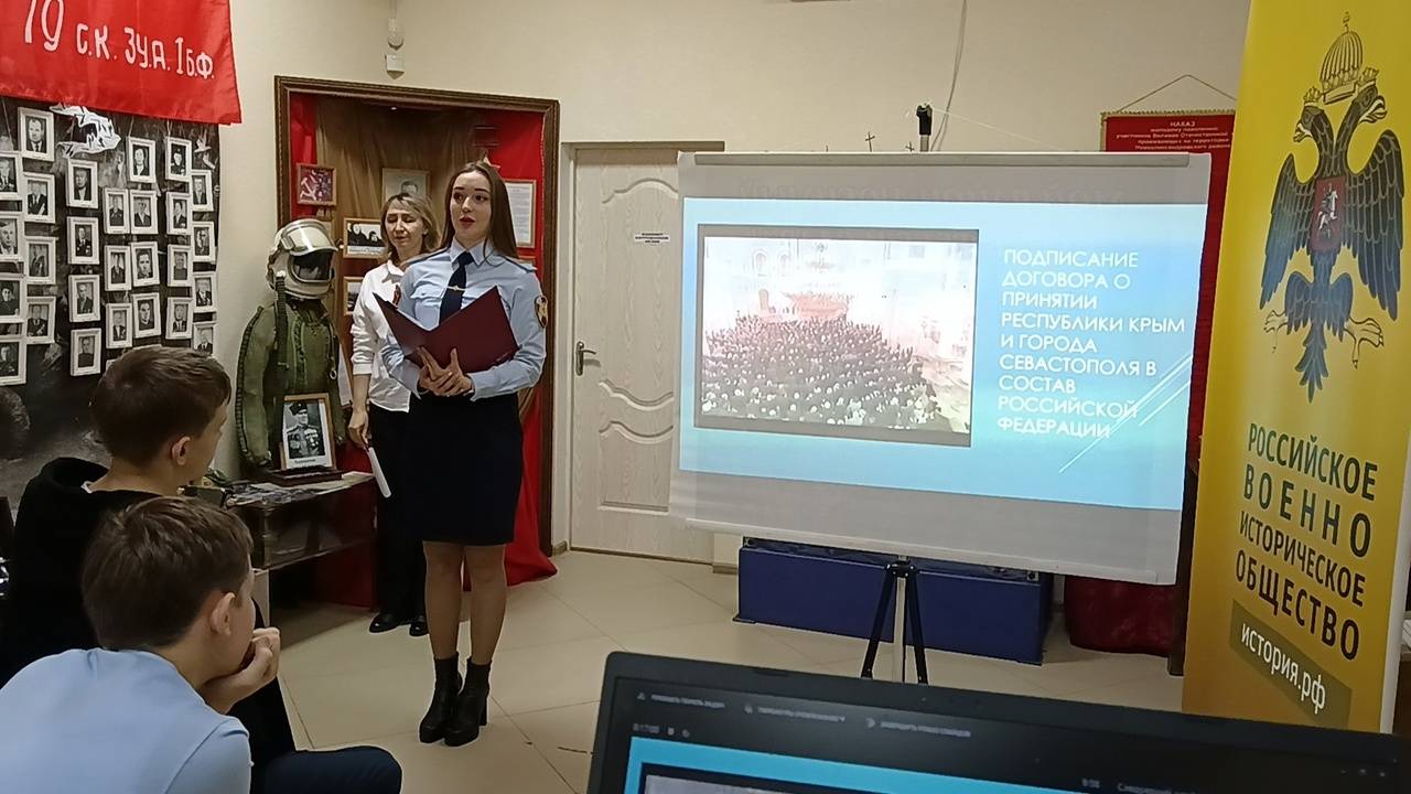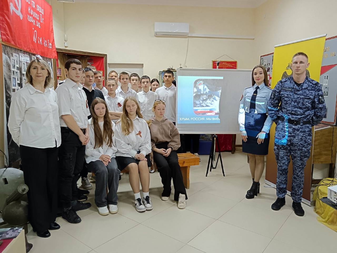 18 марта 2025 г. в Новоалександровском районном музее для учащихся 8 класса МОУ СОШ №4 пос. Темижбекского прошёл музейный урок «Крым. Возвращение в родную гавань». Гостями мероприятия стали сотрудники МОВО по Новоалександровскому муниципальному округу-филиала ФГКУ «УВО ВНГ России по Ставропольскому краю», которые кратко рассказали школьникам о важности и историческом значении этого памятного для нашей страны события.