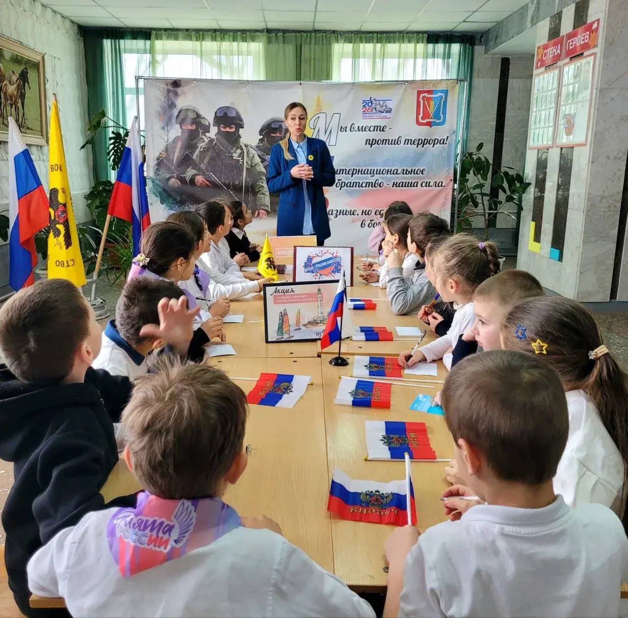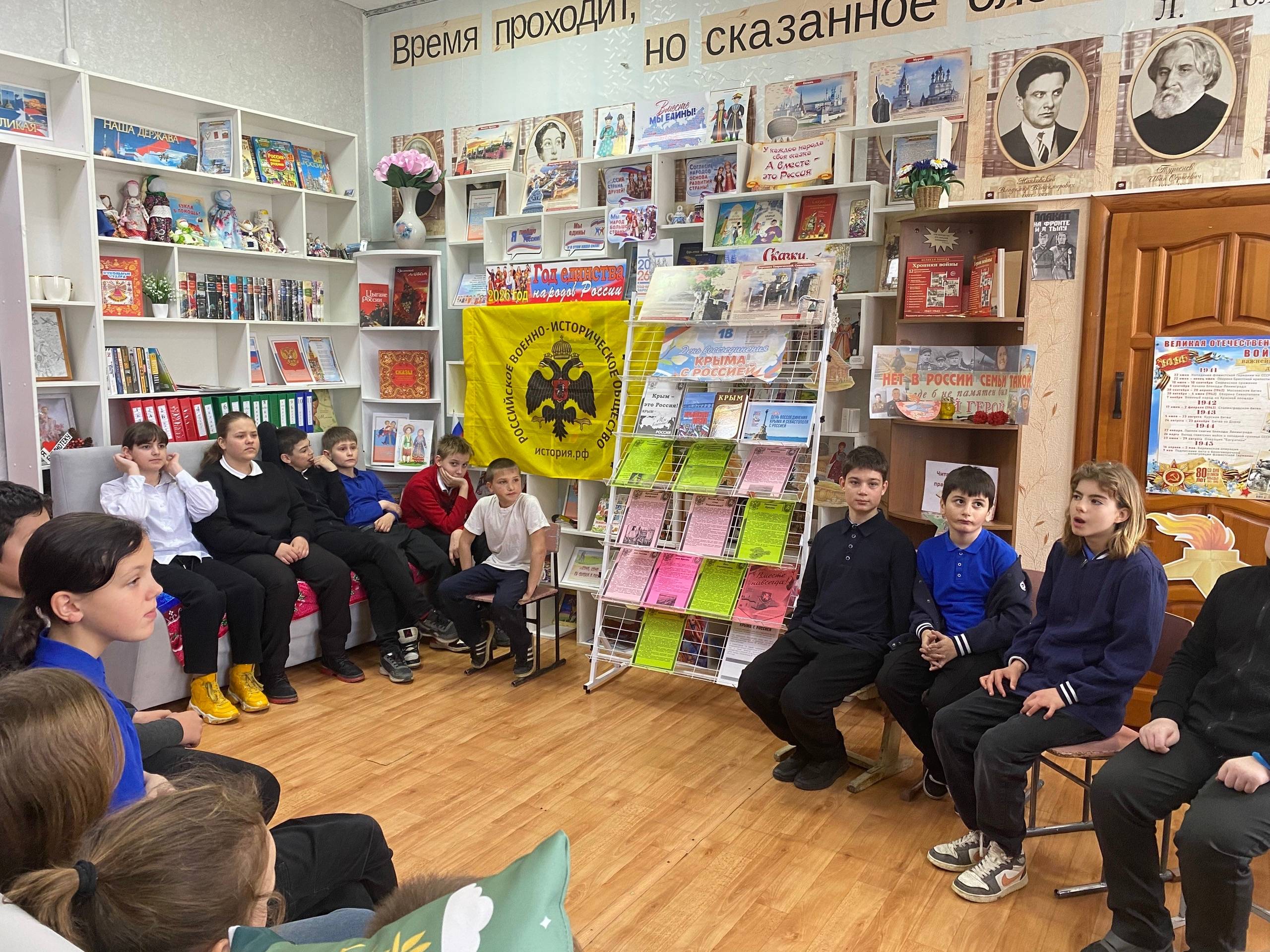 В Сергиевской сельской библиотеке Грачёвского округа (библиотекарь – Жалыбина Г.М., член Местного отделения РО РВИО СК в Грачёвском муниципальном округе (председатель – Степаненко Н.И.)) прошла акция «В единстве наша сила». Для подрастающего поколения была организована фотовыставка и беседа «Герои России – герои Крыма». Библиотекари представили школьникам Книгу Памяти, рассказывающую о бойцах, погибших в ходе СВО. Особый отклик у посетителей вызвала выставка «Крымская весна», объединившая ключевые вехи истории полуострова и портреты современных героев, отдавших жизни за свободу от неонацизма.