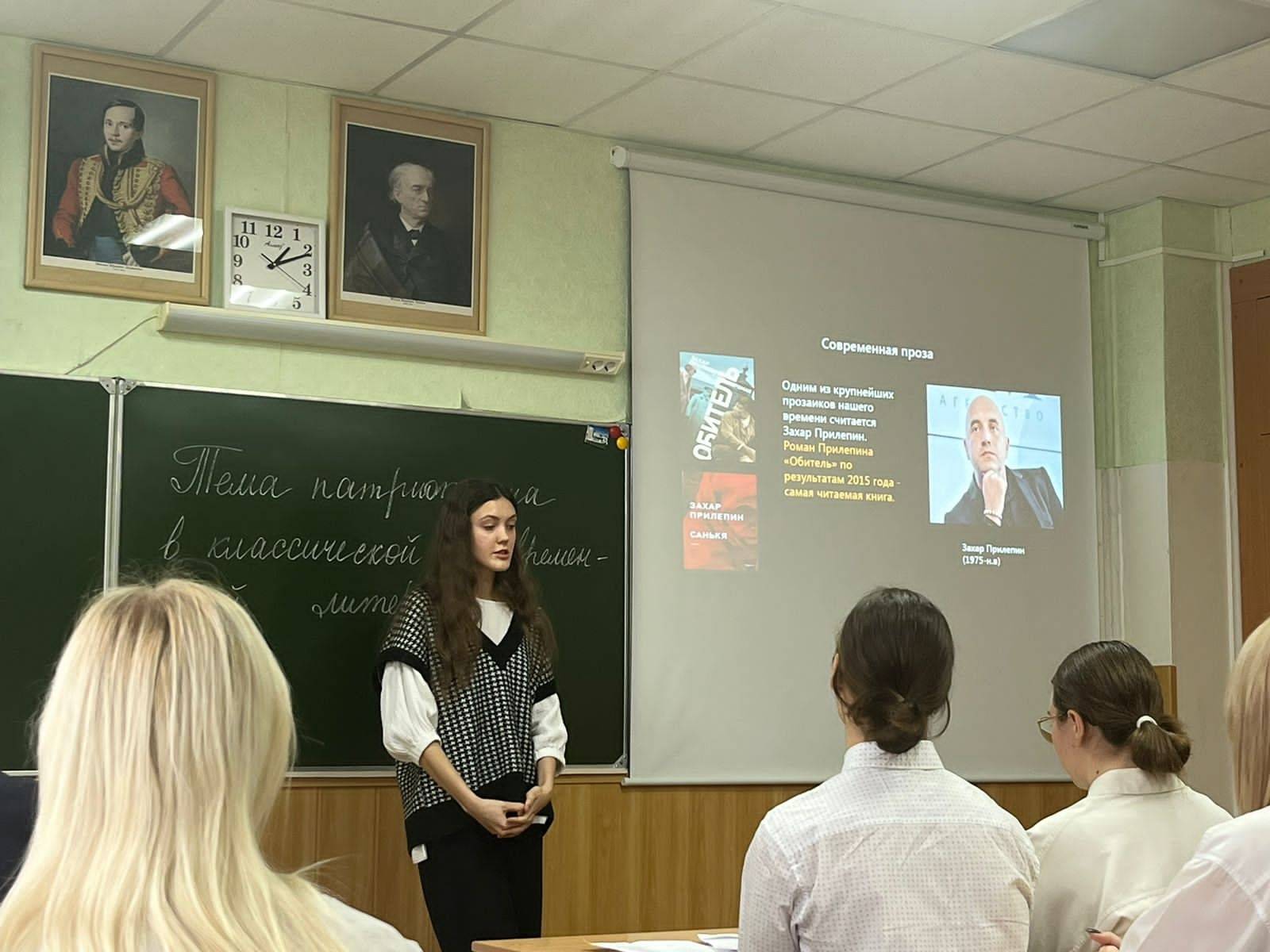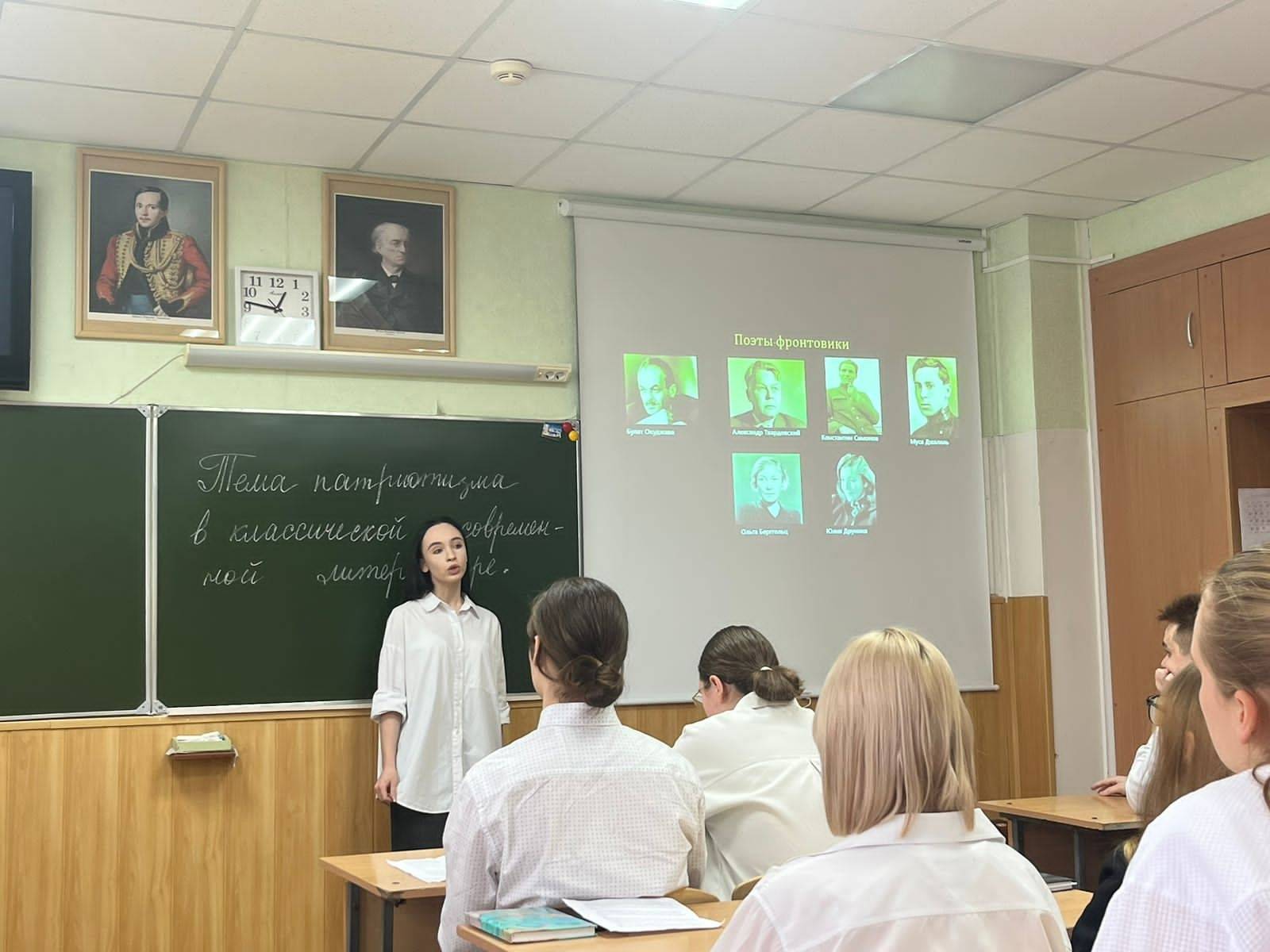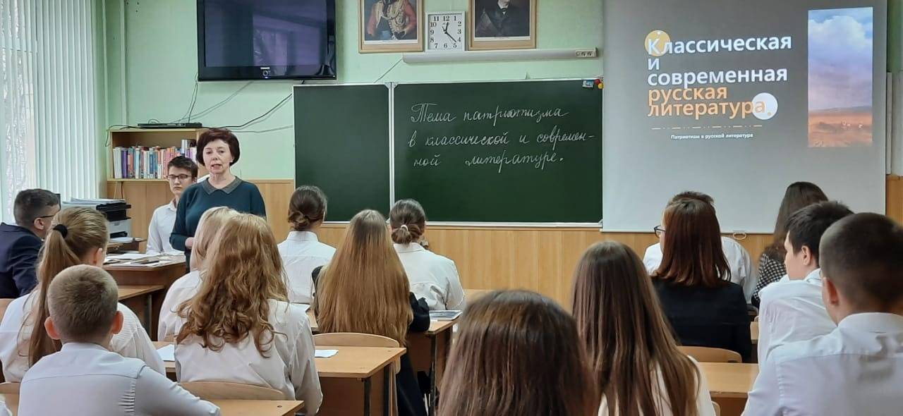 Школьники обсудили, какие черты относятся к понятию «патриотизм», в каких литературных произведениях поднимается тема патриотизма, в какие периоды истории количество подобных книг увеличивалось, как авторы описывали в своих произведениях любовь к Родине, защиту Отечества, воинский долг. Предметом особого внимания стали яркие героические образы из литературных произведений.