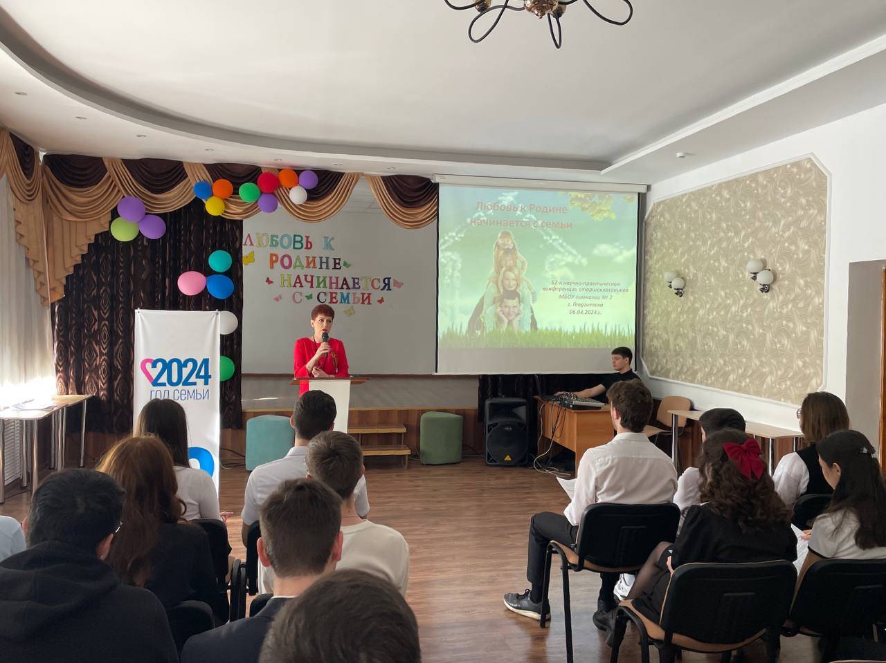 Так, 6 апреля 2024 г. на базе МБОУ гимназия №2 г. Георгиевска под руководством Алексиной Е.Ю., учителя истории и обществознания, председателя Местного отделения РО РВИО СК в Георгиевском городском округе, прошла 52-я традиционная научно-практическая конференция старшеклассников «Россия – Родина моя». Участниками мероприятия стали учащиеся 9-11 классов. Они представили свои доклады по истории, литературе, иностранным языкам, географии, биологии, математике и физической культуре, которые были посвящены теме «Любовь к Родине начинается с семьи».