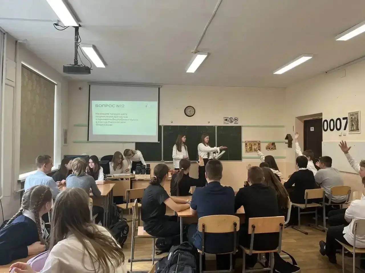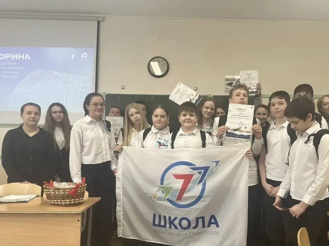 18 марта 2026 г. ученики 6-х классов МБОУ СОШ №7 г. Ставрополя, воспитанники клуба «Юный патриот» Ставропольского регионального отделения Российского военно-исторического общества (РО РВИО СК), отправились в увлекательное путешествие по Крымскому полуострову, не выходя из стен школы. Ребята приняли участие в викторине «Одна страна – одна история». Шестиклассники вспоминали славное прошлое и настоящее Тавриды, обсуждали её уникальную природу и богатую культуру. Мероприятие для учеников было организовано учителем русского языка и литературы Лифановой Е.А., членом РО РВИО СК.