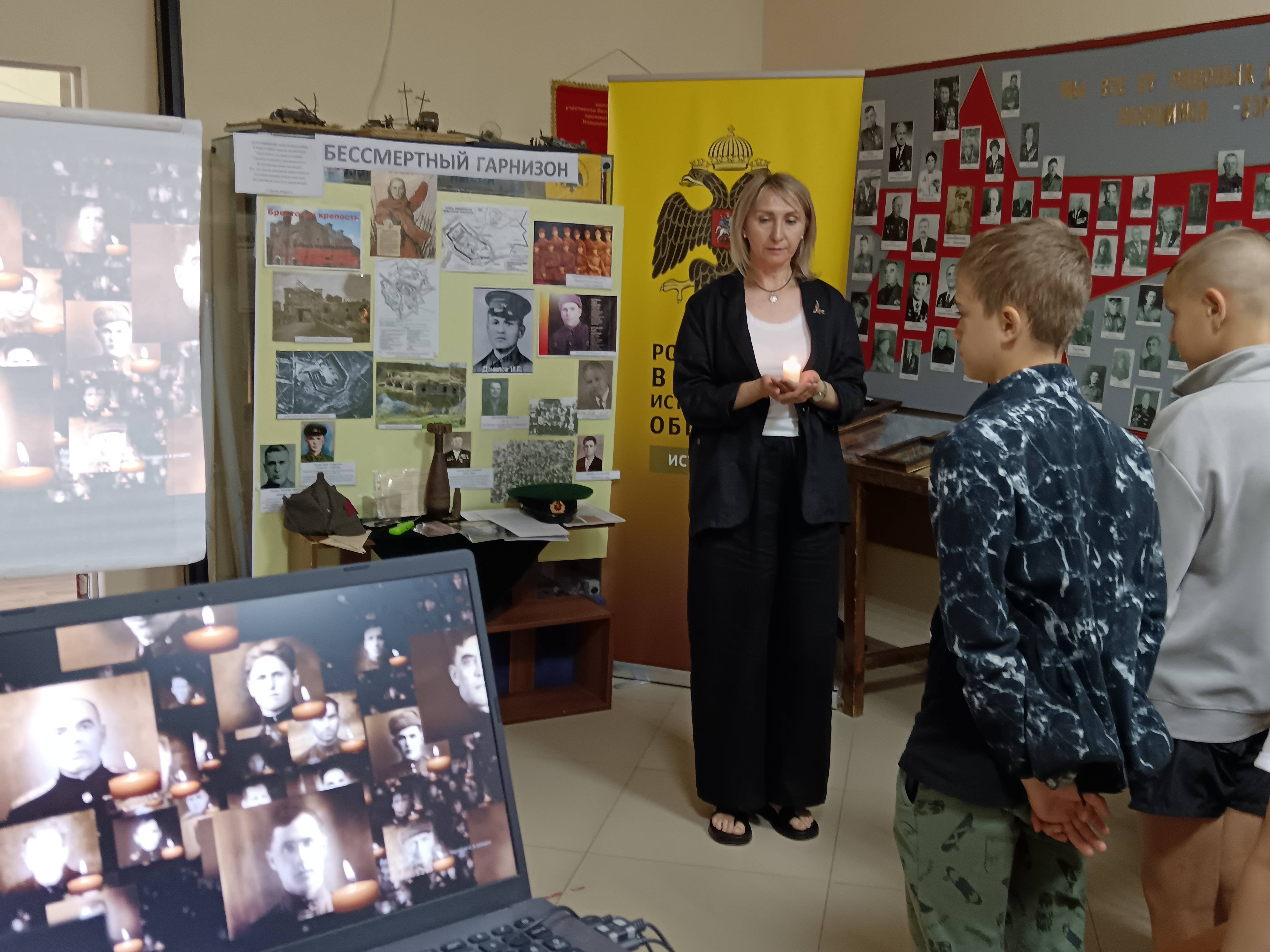 Юным слушателям рассказали о трагических событиях 22 июня 1941 г., когда фашистские войска вторглись на территорию СССР. Тематическая выставка «Бессмертный гарнизон» продемонстрировала страницы обороны Брестской крепости – первой территории, вставшей на пути врага. Повествование было дополнено фотографиями и документами земляков-защитников Брестской крепости, краткими сведениями о тех из них, кто прошёл всю войну – от Бреста до Берлина. Ребята узнали о героях-земляках, павших в первые дни войны – Данилове И.Г., Шурьянском П.Ф., Голубцове (Голинцове) Н.И. и Выходцеве М.М., а также о тех, кто выжил в боях, прошёл всю войну и вернулся с Победой – Юзифовиче Г.В., Донецком И.Я. и других.