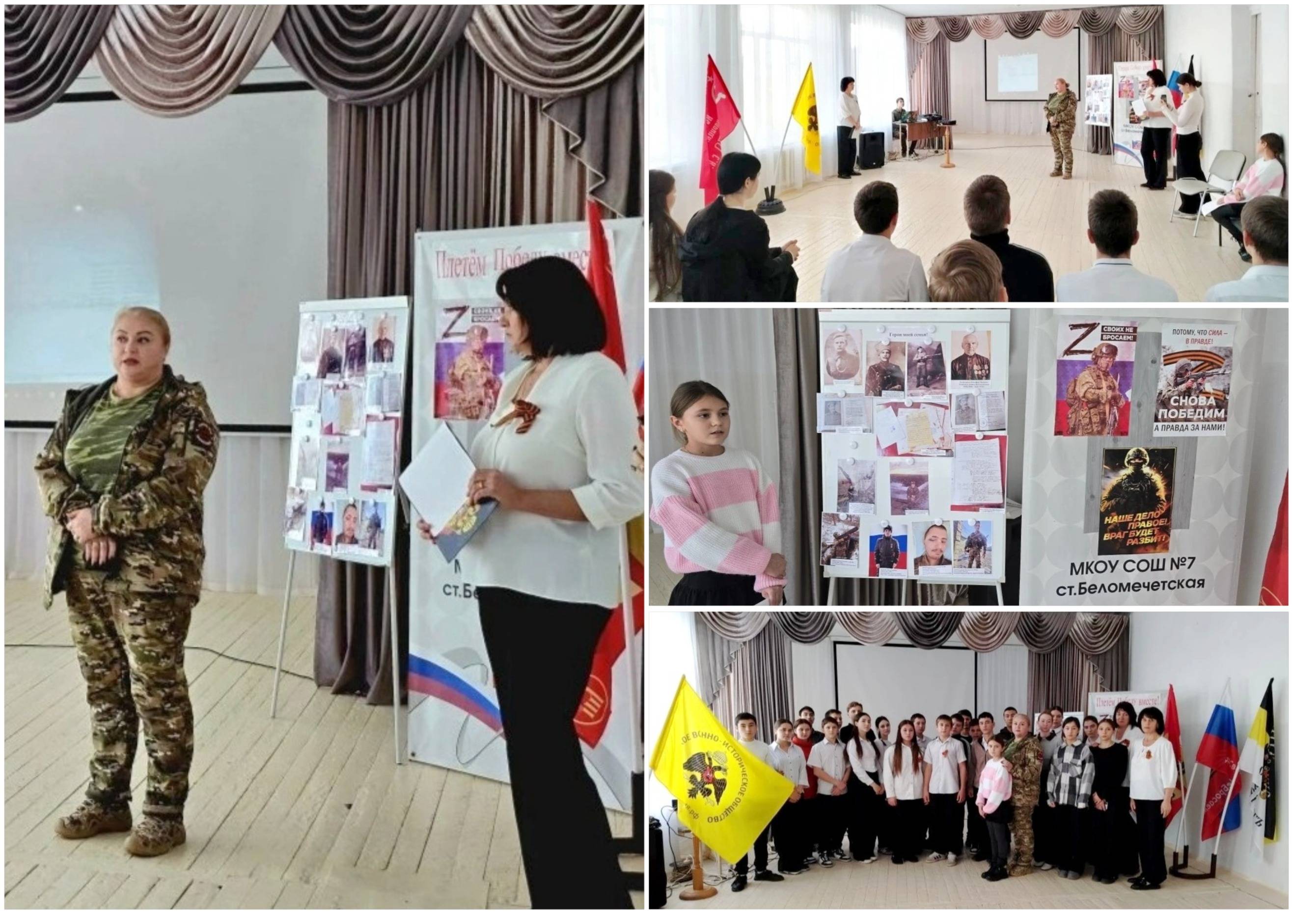 8 декабря 2025 г. в стенах Беломечëтской школы (директор – Волосовцева Е.А., член Местного отделения РО РВИО СК в Кочубеевском муниципальном округе (председатель – Котов С.Н.)) состоялся урок мужества для учащихся 9-11 классов. Почётным гостем встречи стала А.В. Чернова – руководитель группы волонтёрского движения «Своих не бросаем ZV26», оказывающего помощь участникам СВО. Её семья – настоящая летопись служения Родине. Александра Владимировна является внучкой ветерана трёх войн – Первой мировой, Гражданской и Великой Отечественной – Никифора Ивановича Овчинникова. А мужчины семьи и сегодня продолжают ратную традицию, защищая национальные интересы страны. Особое впечатление на ребят произвело выступление Пелагеи – дочери Александры Владимировны, ученицы 5 класса. Девочка трогательно рассказала о героях своей семьи, продемонстрировав глубокое уважение к их подвигу. В рамках урока была организована тематическая выставка с портретами героев, которая позволила учащимся лучше познакомиться с историей их подвигов.