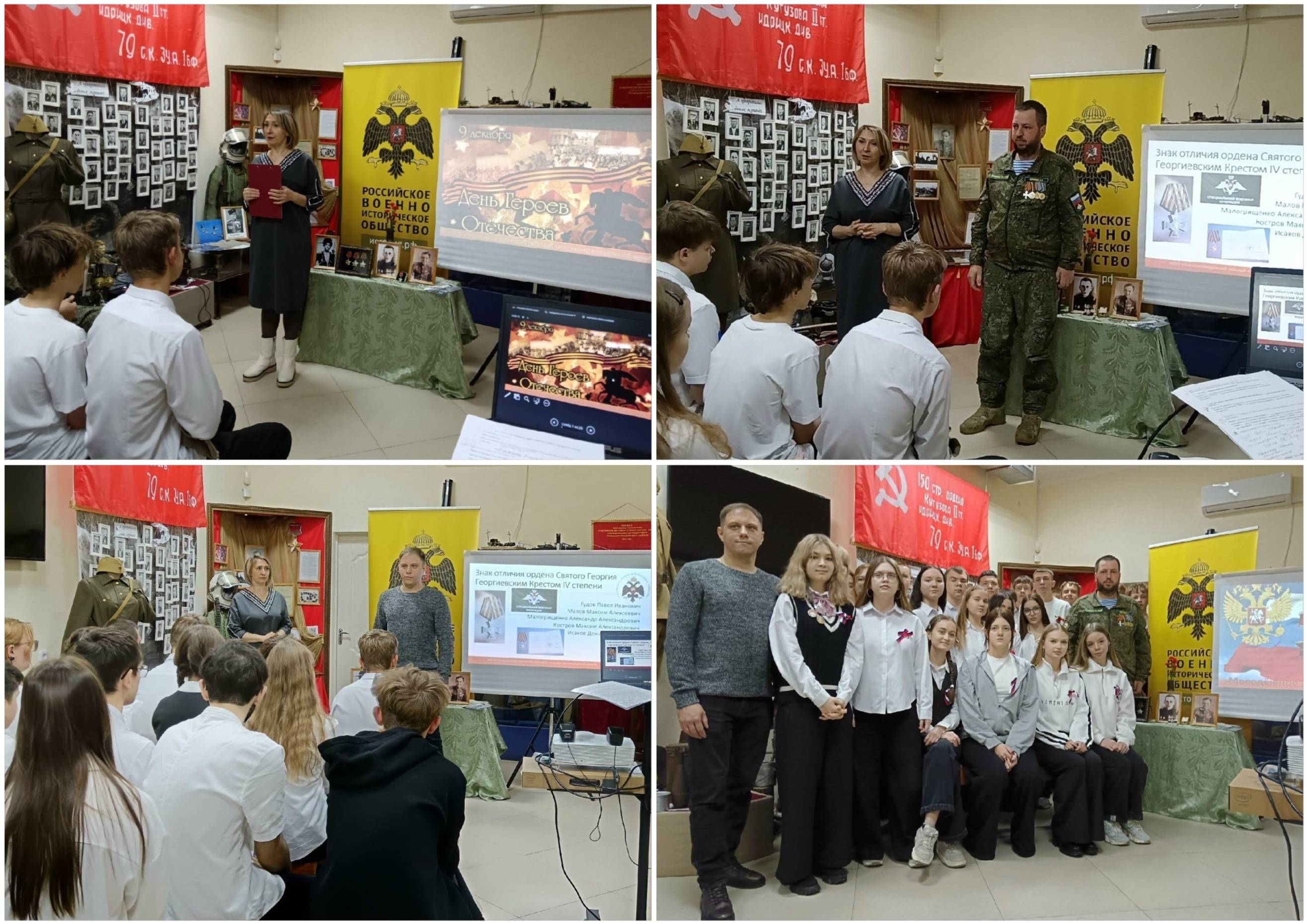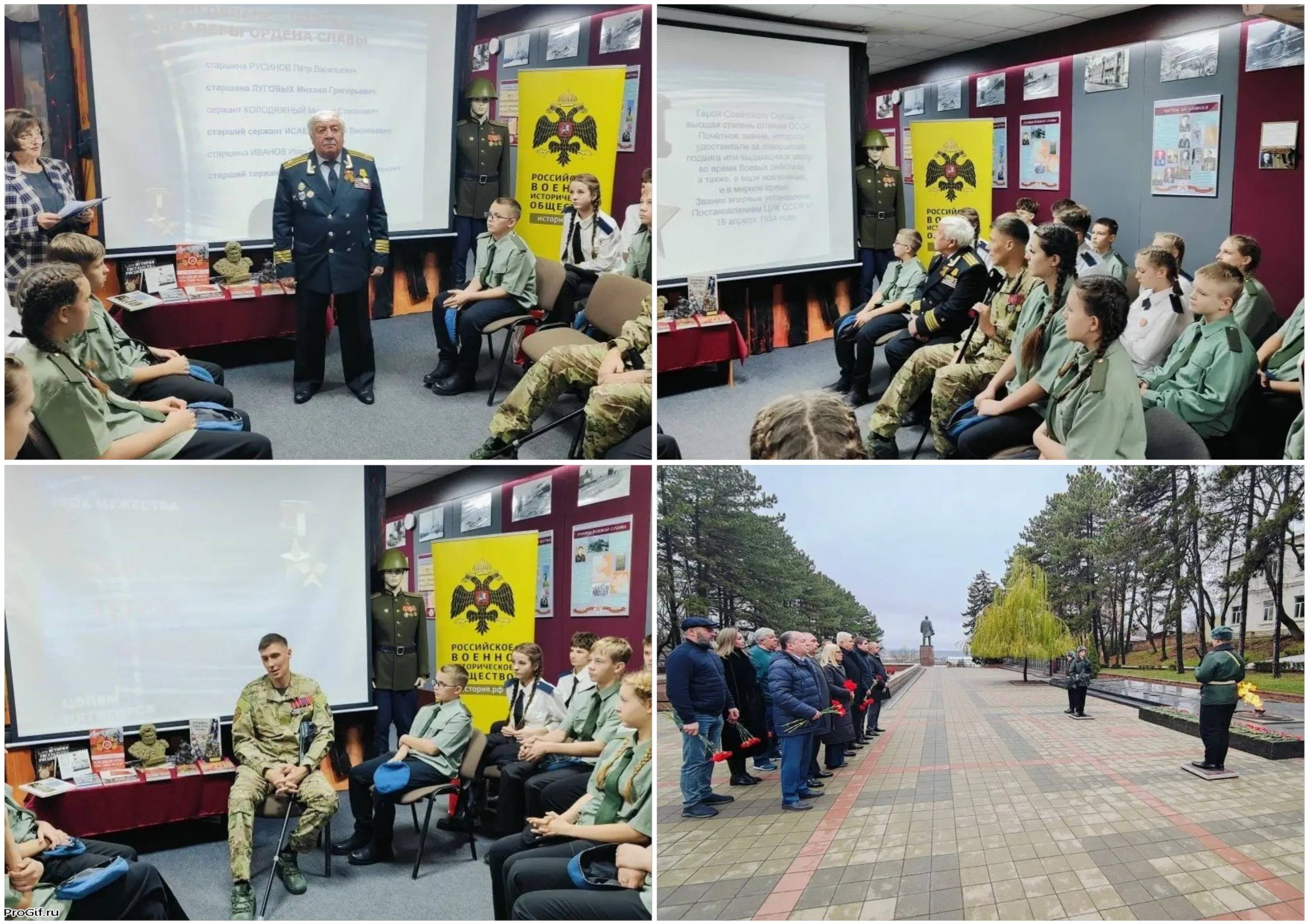 В г. Пятигорске на базе Центра военно-патриотического воспитания молодёжи (директор – Ткаченко И.А., член Местного отделения РО РВИО СК в городе-курорте Пятигорске (председатель – Ворошилов Д.Ю.)) для учащихся МБОУ СОШ №30 им. А.С. Пушкина, юнармейцев почётного караула им. участника Великой Отечественной войны, заслуженного учителя Российской Федерации, почётного гражданина г. Пятигорска, почётного часового Поста №1 В.А. Кобрина, прошёл урок мужества «Твои Герои, Россия!». Гостями мероприятия стали председатель Совета ветеранов г. Пятигорска капитан 2-го ранга Николай Лега и ветеран боевых действий, начальник штаба Пятигорского отделения «Юнармии», председатель местного отделения Ассоциации ветеранов Специальной военной операции, депутат думы г. Пятигорска, педагог дополнительного образования лицея №20 Дмитрий Кулаков. Также состоялось возложение цветов представителями депутатского корпуса к Вечному Огню, где несли пост юные патриоты.