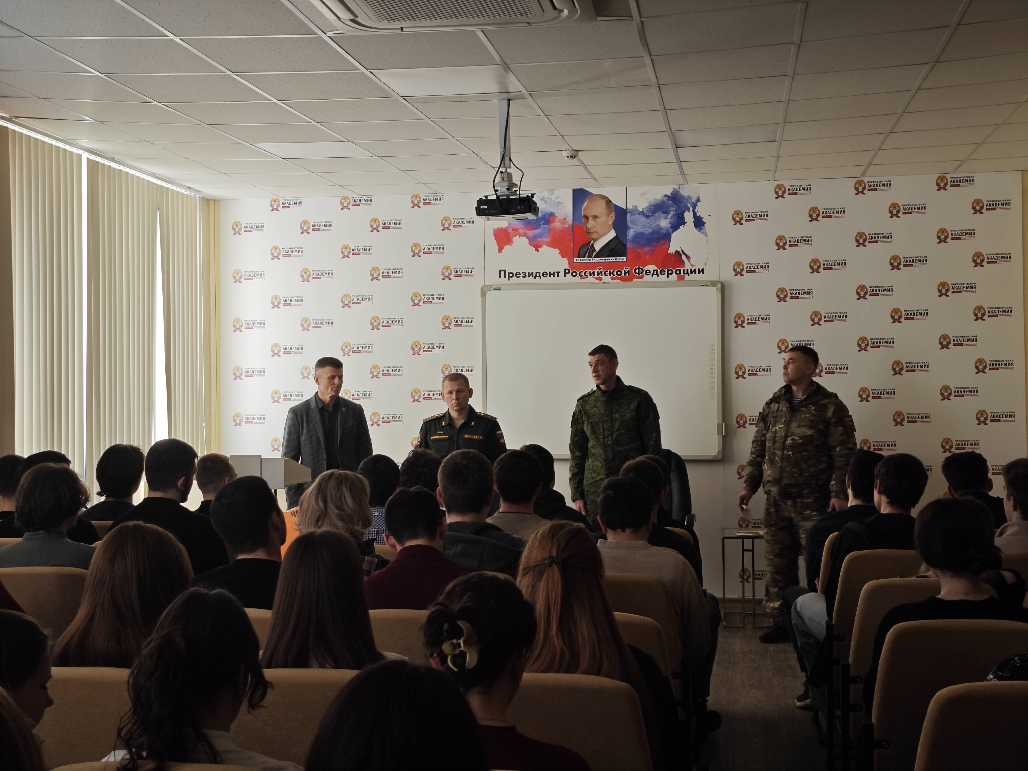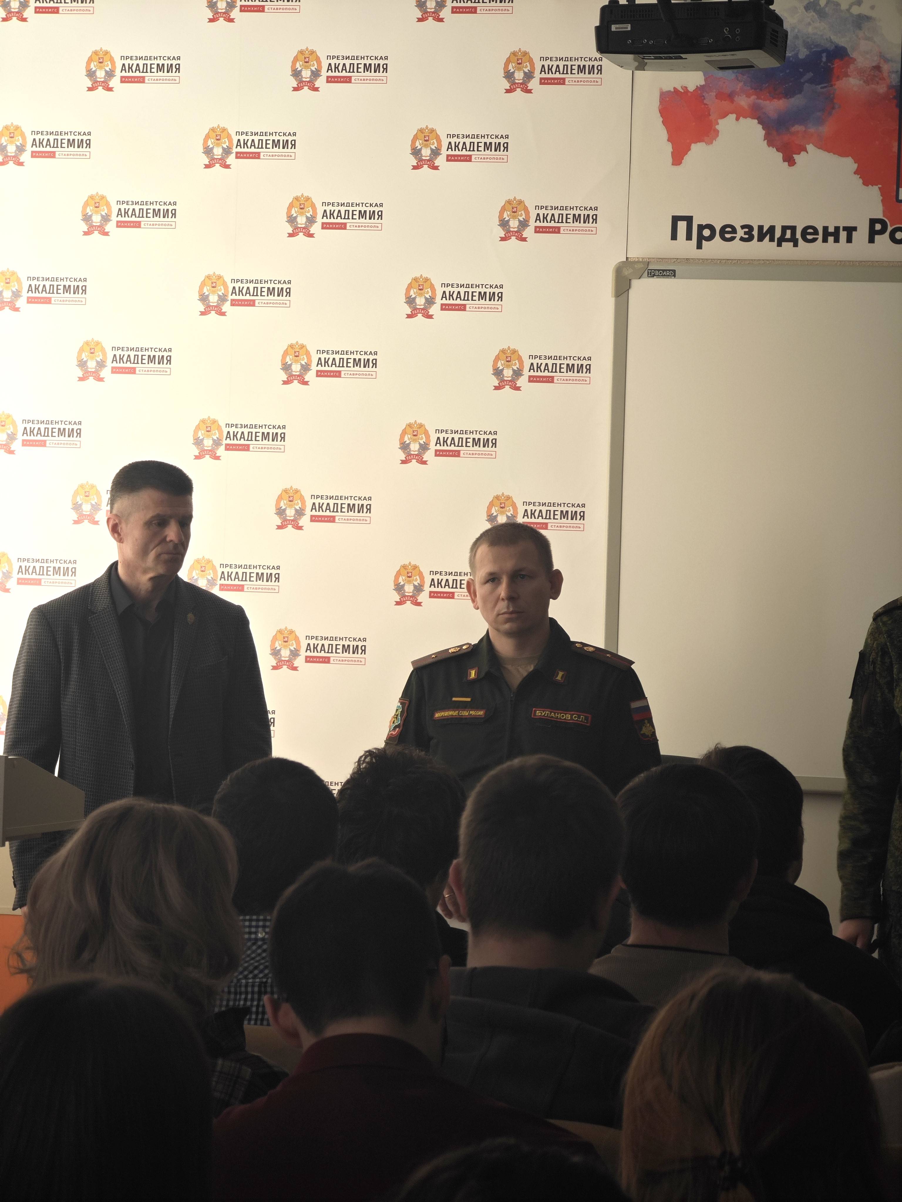 Член Ставропольского регионального отделения Российского военно-исторического общества (РО РВИО СК) Сухомлинов С.А., заместитель руководителя отдела по противодействию терроризму и взаимодействию с правоохранительными органами Комитета общественной безопасности администрации г. Ставрополя, ветеран боевых действий, полковник запаса, продолжает принимать участие в информационно-разъяснительной работе с учащейся молодёжью Ставрополя. На этот раз, 12 марта 2026 г., состоялась встреча со студентами Ставропольского филиала Российской академии народного хозяйства и государственной службы при Президенте Российской Федерации (РАНХиГС). Главной темой обсуждения стали возможности прохождения военной службы по контракту и перспективы, открывающиеся перед молодыми людьми в новейшем роде войск – Войсках беспилотных систем ВС РФ. Студентам подробно разъяснили порядок заключения контракта, критерии отбора кандидатов, а также широкий спектр социальных гарантий и мер государственной поддержки, предоставляемых военнослужащим.