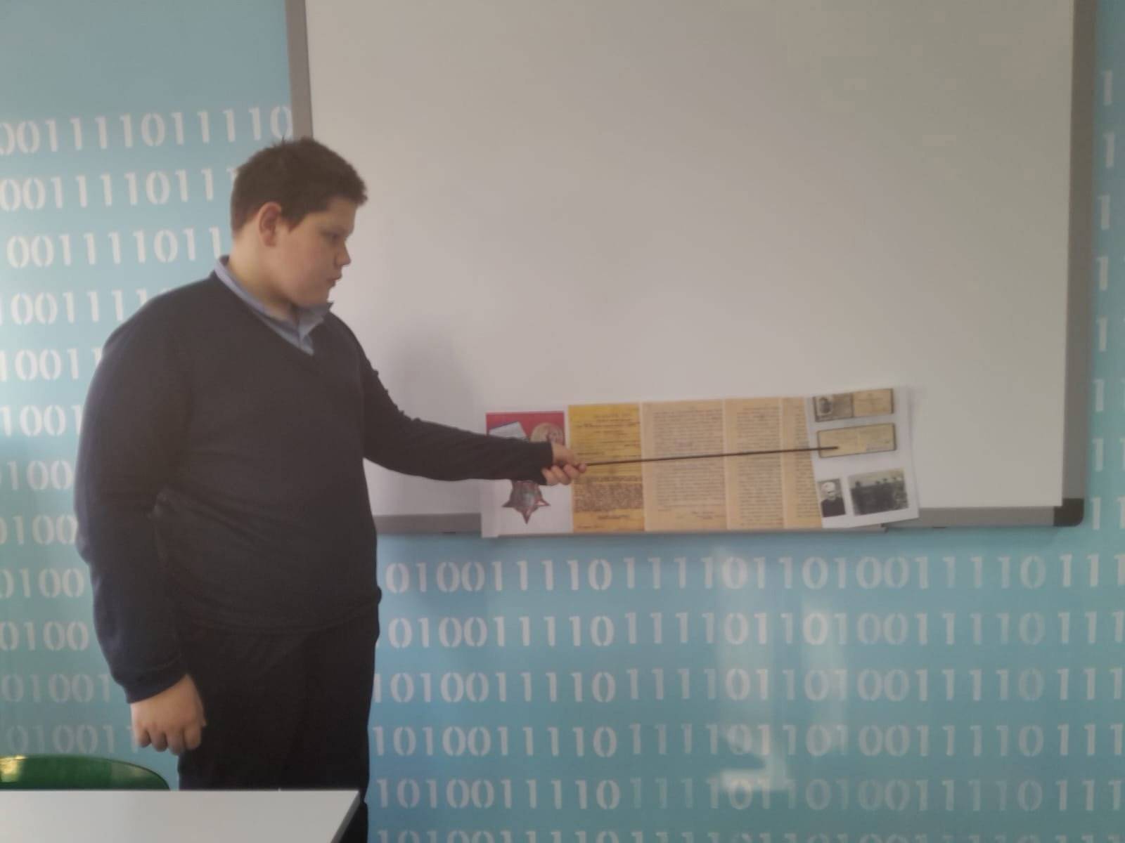 Для учащихся школы также прошёл патриотический час «Отвагой и мужеством рождённые Герои», организованный Шишкиным В.Н. Ученик 5А класса Сикорский Дмитрий рассказал о своём прадеде – участнике Великой Отечественной войны Е.И. Курбатове.