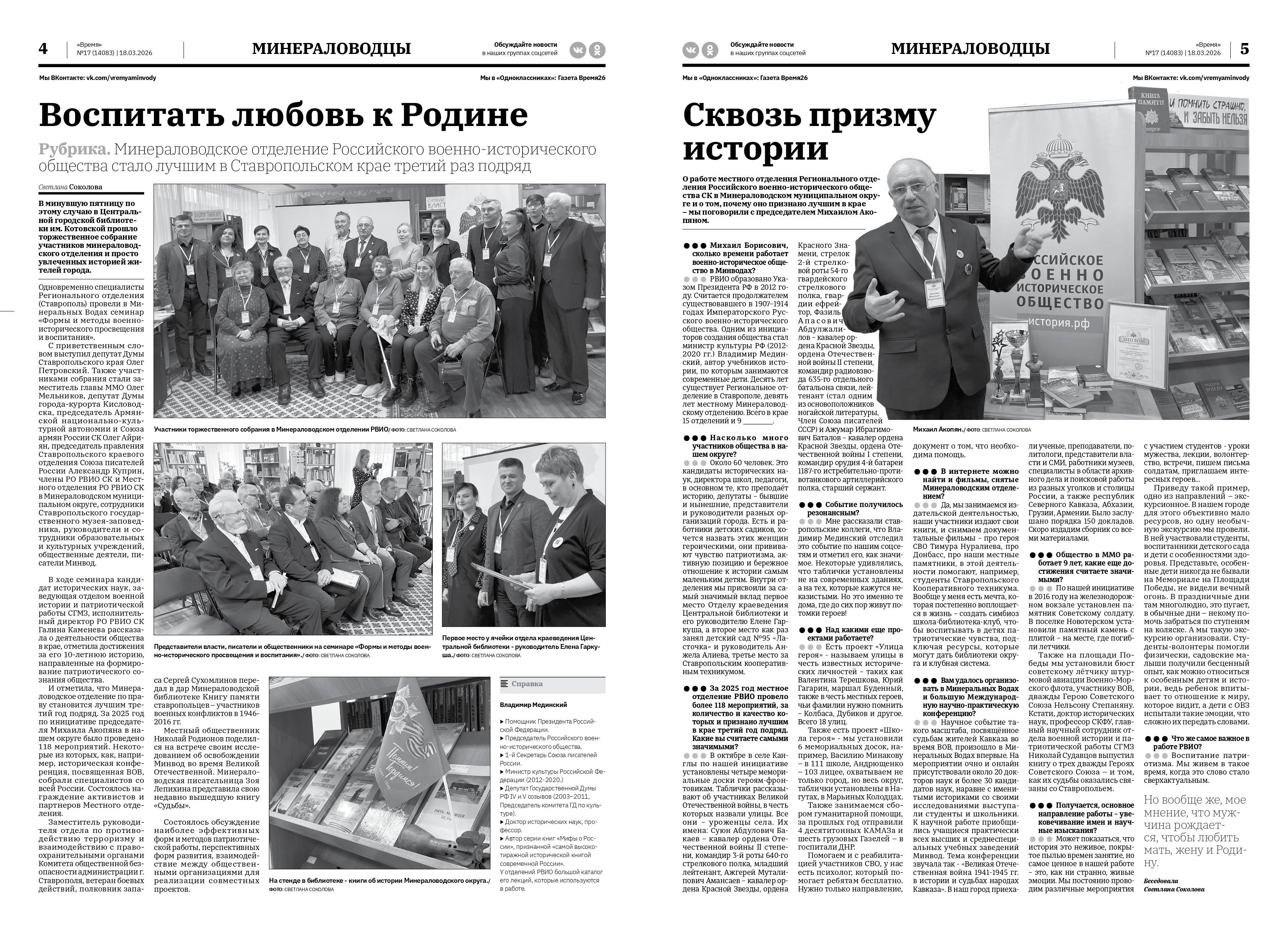 Работа активистов Минераловодского местного отделения РО РВИО СК, занявшего 1 место по итогам работы за 2025 г., не остаётся незамеченной. В выпуске газеты «Время» от 18 марта 2026 г. вышли материалы, посвящённые деятельности Отделения. Одна из статей посвящена семинару «Формы и методы военно-исторического просвещения и воспитания», прошедшему 13 марта 2026 г. Другой материал рассказал читателям о текущей работе Отделения и ключевых направлениях его деятельности по сохранению исторической памяти.