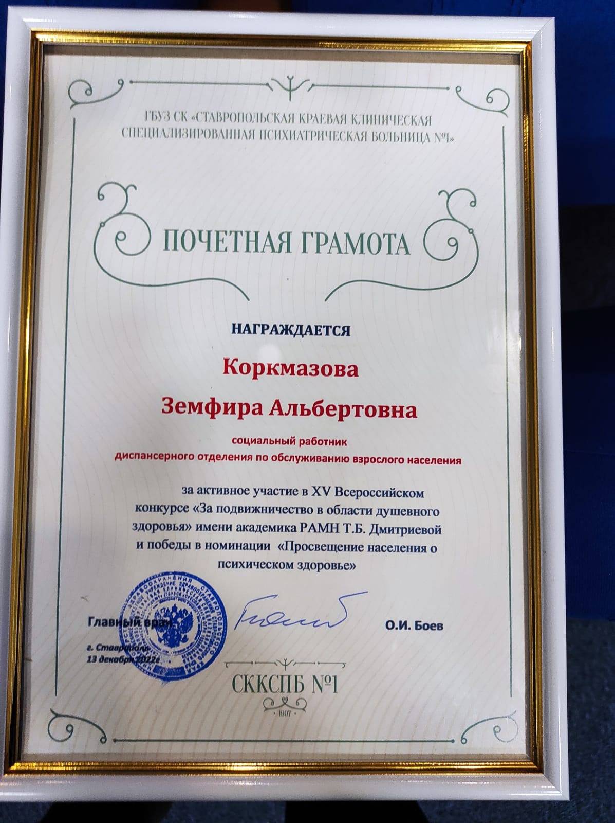 Победителем в номинации «Просвещение населения о психическом здоровье» стал коллектив Ставропольской краевой клинической психиатрической больницы №1 (СККПБ №1). В состав делегации, прибывшей на церемонию награждения, вошла Коркмазова З.А., к.ф.н., социальный работник диспансерного отделения по обслуживанию взрослого населения СККПБ №1, хранитель музея истории больницы, научный сотрудник Ставропольского государственного музея-заповедника (СГМЗ), член Ставропольского регионального отделения Российского военно-исторического общества (РО РВИО СК).