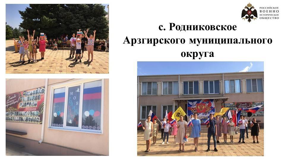 Представители Местного отделения РО РВИО СК в с. Родниковском Арзгирского муниципального округа (председатель – Н.Н. Новак), специалисты Центра культуры, досуга и спорта вместе с жителями села Родниковского, представителями различных структурных подразделений исполнили Гимн России, разместили на воротах своих домов, на зданиях организаций села флаги любимой страны, оформили окна картинками, надписями, символикой, посвященной России. Воспитанники пришкольного лагеря «Солнышко» под руководством педагогов, членов РО РВИО СК приняли участие в триколорном забеге по улицам села с флагами России и лентами в цветах российского флага, для ребят состоялась конкурсно–познавательная программа, где дети отвечали на вопросы о России, вспомнили пословицы, отгадывали загадки.
