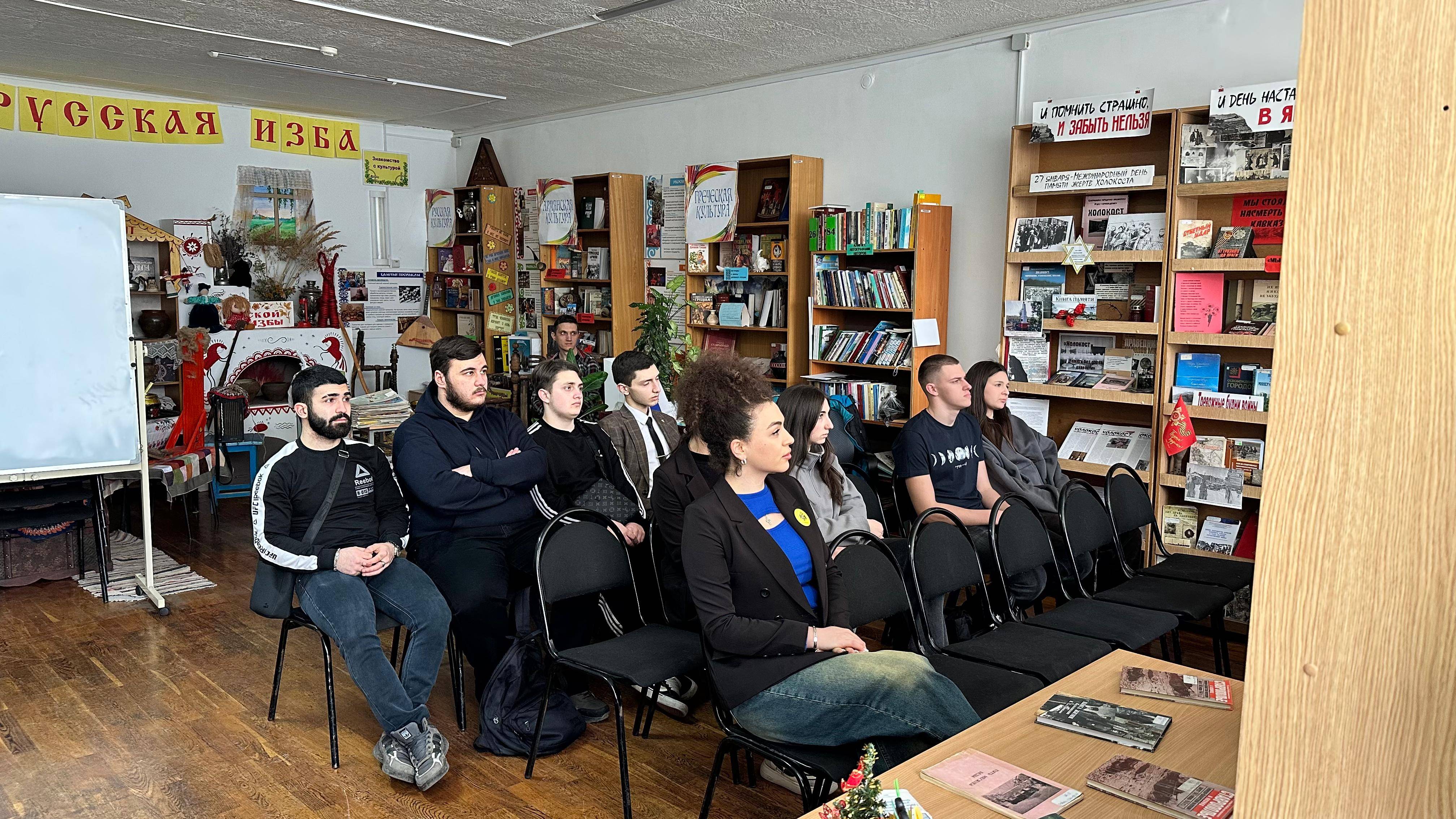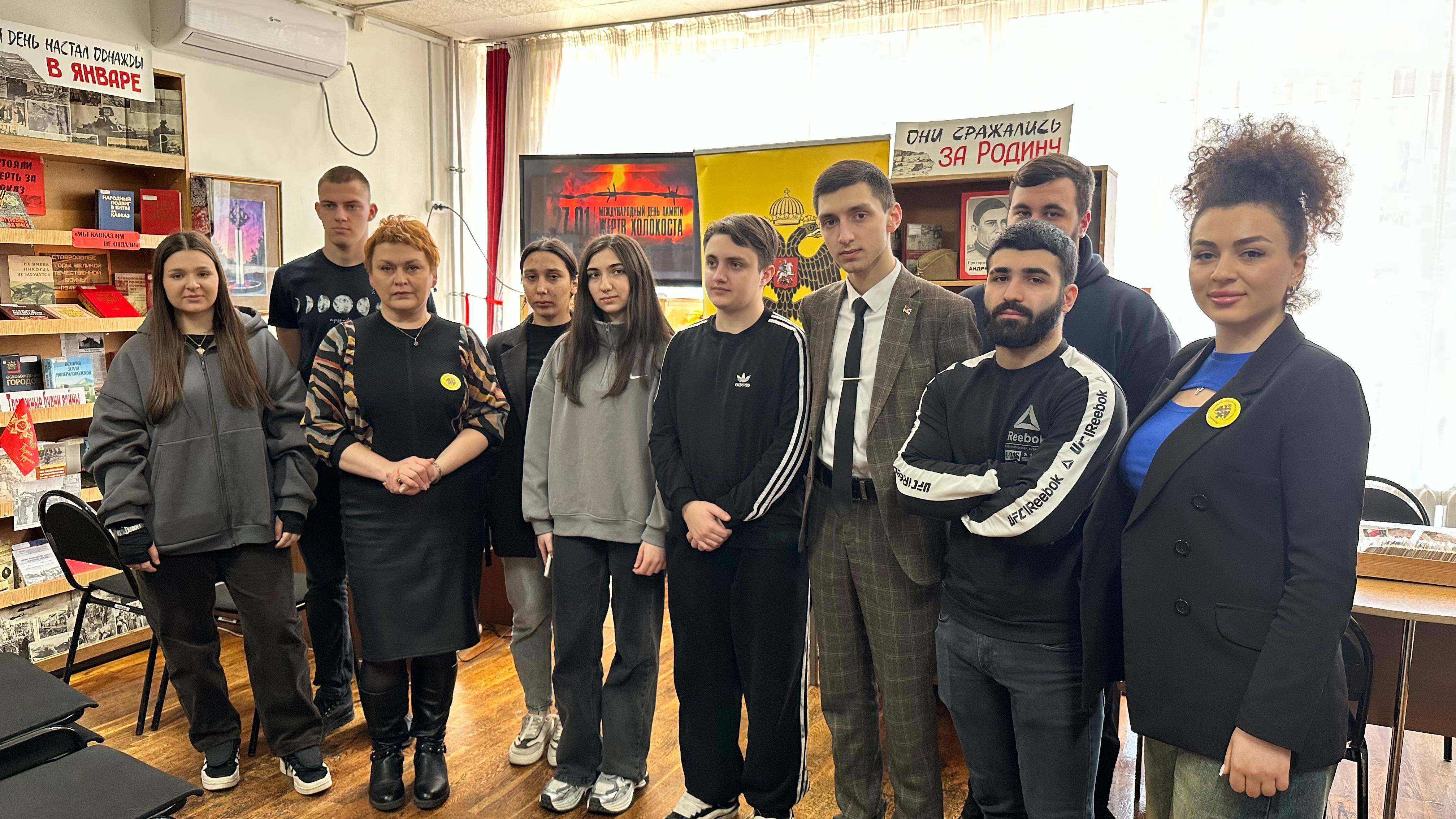 28 января 2025 г. в отделе краеведения Центральной городской библиотеки г. Минеральные Воды состоялось мероприятие, посвящённое Дню памяти жертв Холокоста. Его организатором выступила библиотекарь Гаркуша Е.А., член Местного отделения РО РВИО СК в Минераловодском муниципальном округе (председатель – Акопян М.Б.). Участниками мероприятия стали студенты группы ЮО-1/11 Северо-Кавказского института (филиала) АНО ВО МГЭУ под руководством помощника директора по воспитательной работе Акопян Л.М., члена РО РВИО СК. Ребята ознакомились с выставкой, где были представлены документы, фотографии и другие материалы, рассказывающие о трагедии Холокоста. Елена Афанасьевна подробно рассказала о страшных событиях, произошедших в годы Второй мировой и Великой Отечественной войн, уделив особое внимание судьбам миллионов людей, ставших жертвами нацистских преступлений.