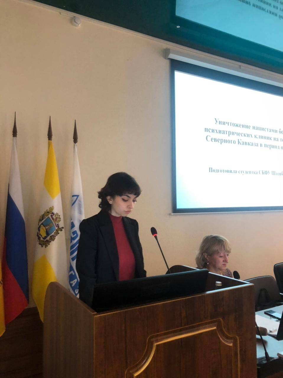 Стрекалова Е.Н. рассказала о планах нацистской Германии по отношению к народам Кавказа. Также с докладами выступили студенты СКФУ – М. Синицына, Н. Штенберг, И. Рева и курсант Голицынского пограничного института ФСБ России – Ч. Хурумов. Они осветили тему нацистских преступлений на Ставрополье – в г. Пятигорске, в Краснодарском крае – в Тихорецком районе, на территории Северного Кавказа – в Северной Осетии-Алании. Отдельный доклад был посвящен преступлениям против больных психиатрической больницы.