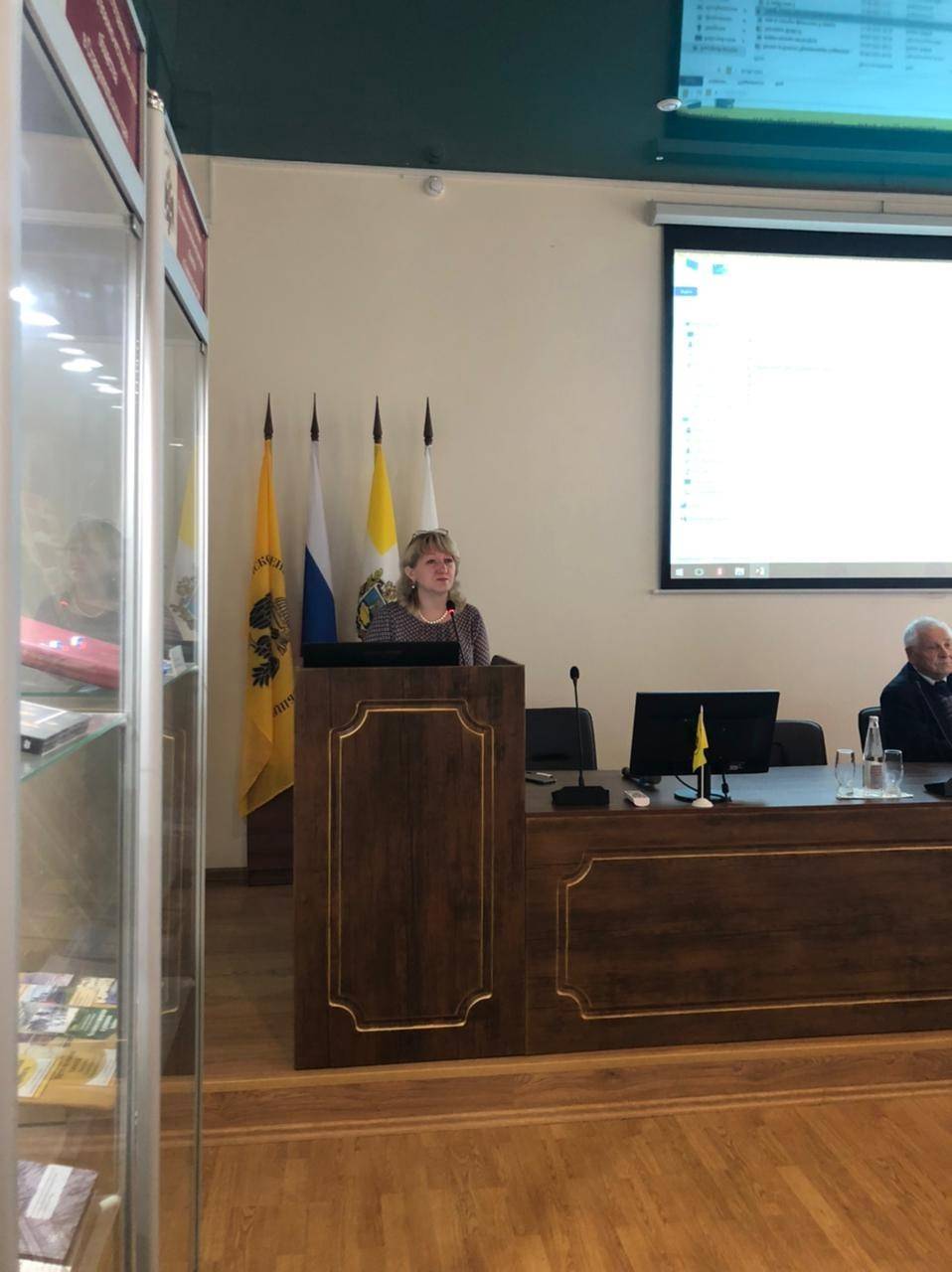Ведущей круглого стола стала Е.Н. Стрекалова, к.и.н., доцент кафедры истории России СКФУ, старший научный сотрудник отдела военной истории и патриотической работы СГМЗ, член РО РВИО СК.