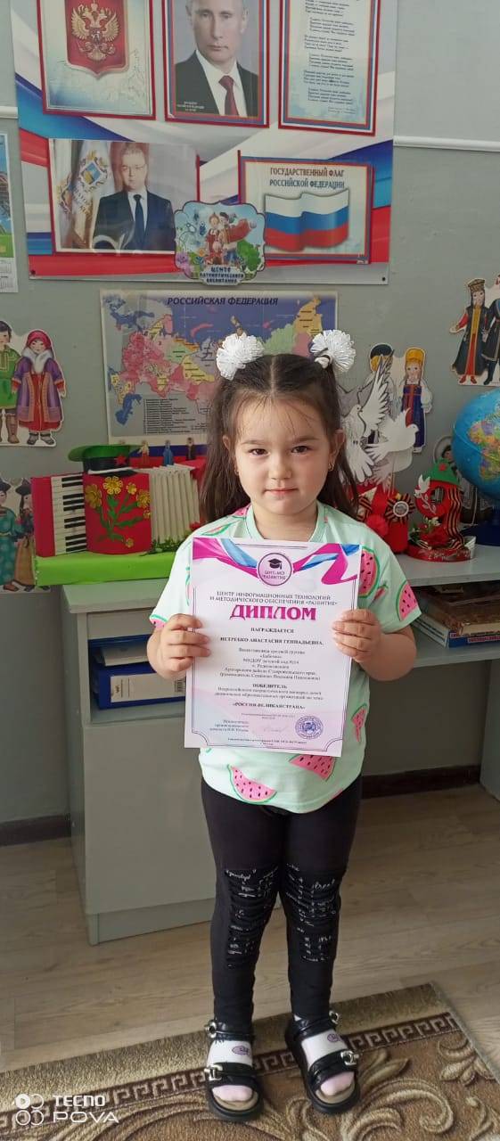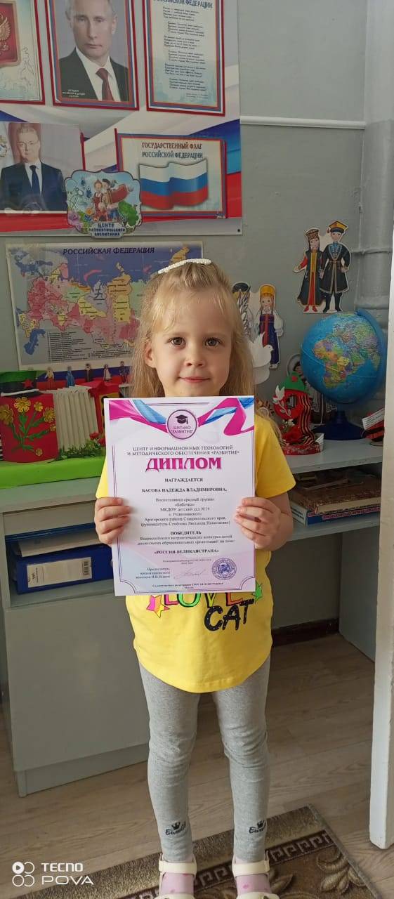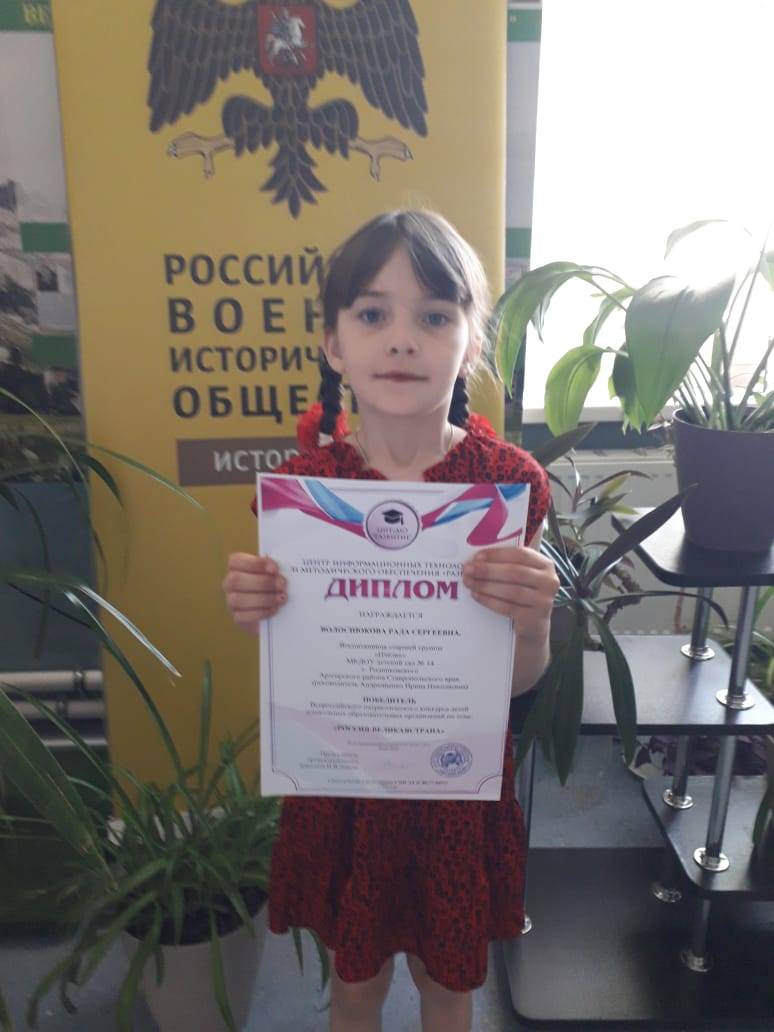 Так, воспитанники средней и старшей групп МКДОУ д/с №14 «Колокольчик» с. Родниковского Арзгирского муниципального округа (заведующий – Туз И.А., член Местного отделения РО РВИО СК в с. Родниковском (председатель – Новак Н.Н.)) под руководством воспитателя И.Н. Андрющенко, члена РО РВИО СК, приняли участие во Всероссийском патриотическом конкурсе дошкольных образовательных организаций «Россия – великая страна» и стали его победителями.