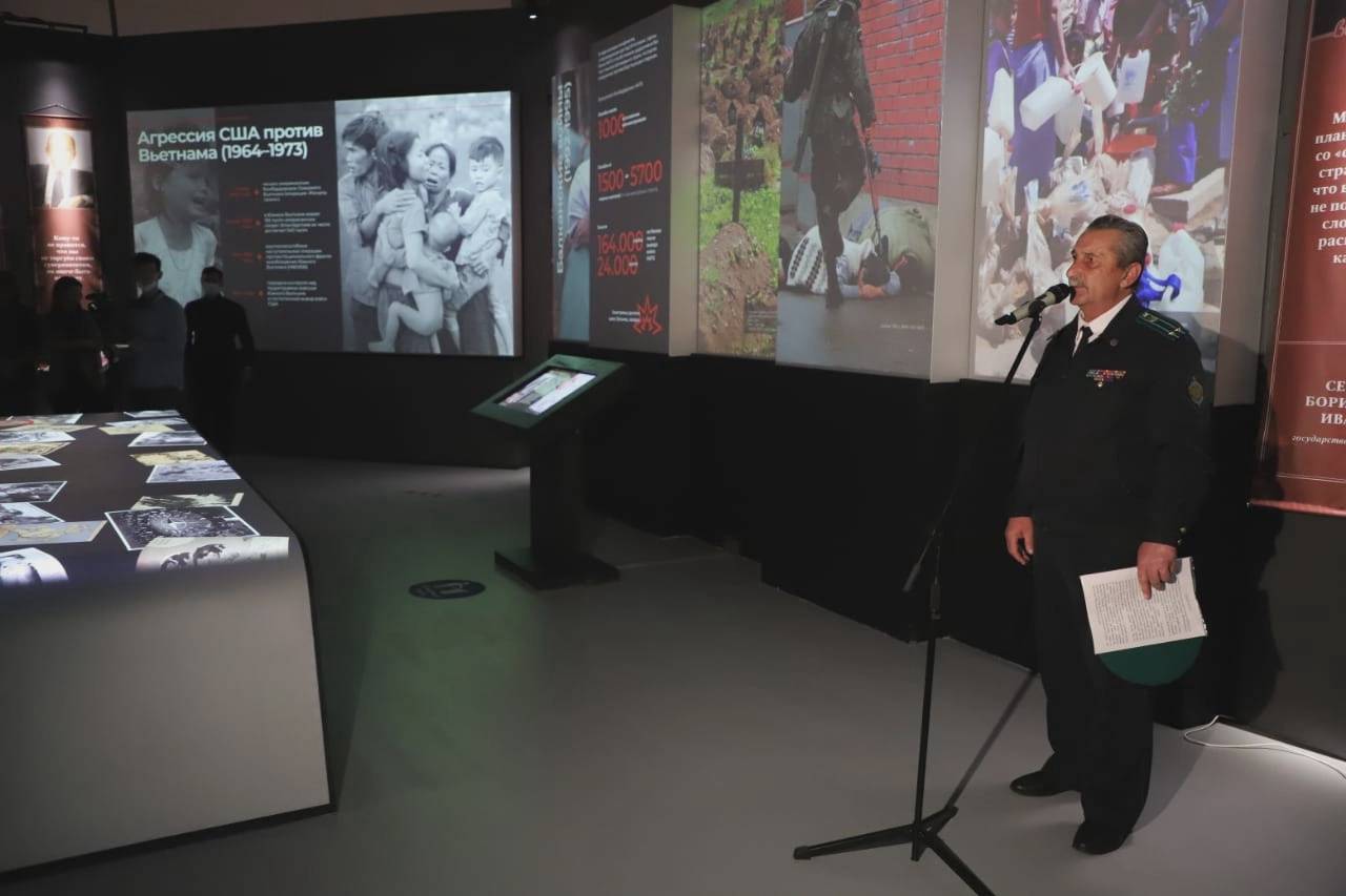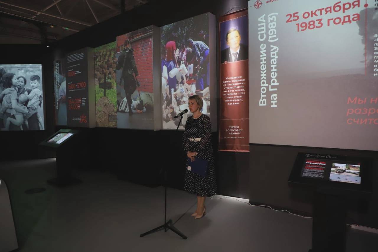Экскурсовод Д. Савтырева рассказала о структуре выставки, которая состоит из разделов, рассказывающих об американских бомбардировках Хиросимы и Нагасаки, планах нападения США и их союзников на СССР, разработанных вскоре после Второй мировой войны, локальных конфликтах конца XX – начала XXI века, включая бомбардировки Югославии в 1999 г., войны в Ираке и Афганистане в 2000-е гг., конфликт в Сирии, а также современные события на территории Украины, к которым привело сотрудничество Украины с НАТО.