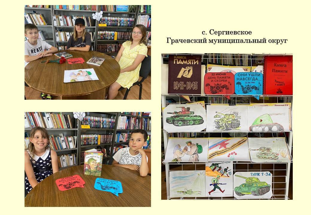 На базе Сергиевской сельской библиотеки (библиотекарь – Жалыбина Г.М., член РО РВИО СК) состоялась выставка детских рисунков «Тот самый первый день войны», а также был проведен час памяти «Там, где память, там слеза».