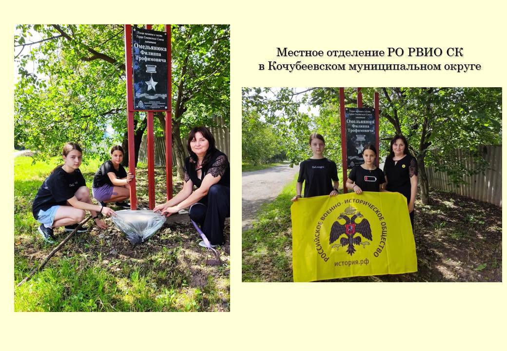 Накануне Дня памяти и скорби активисты Местного отделения (МО) РО РВИО СК в Кочубеевском муниципальном округе (председатель – Котов С.Н.) Солопова Л.Н., главный хранитель фондов МКУК «Кочубеевский историко-краеведческий музей», и Щекина Е.А., зам. директора по воспитательной работе МКОУ СОШ №1 с. Кочубеевского, провели акцию «Чистая память». Вместе с учениками школы они убрали территорию, прилегающую к памятным доскам, установленным РО РВИО СК в рамках проекта «Улица Героя» в 2022 году. К акции присоединились члены «Волонтерской роты» Боевого братства ст. Беломечетской. Участники акции протерли доски от пыли и вынесли весь мусор и сухую траву.