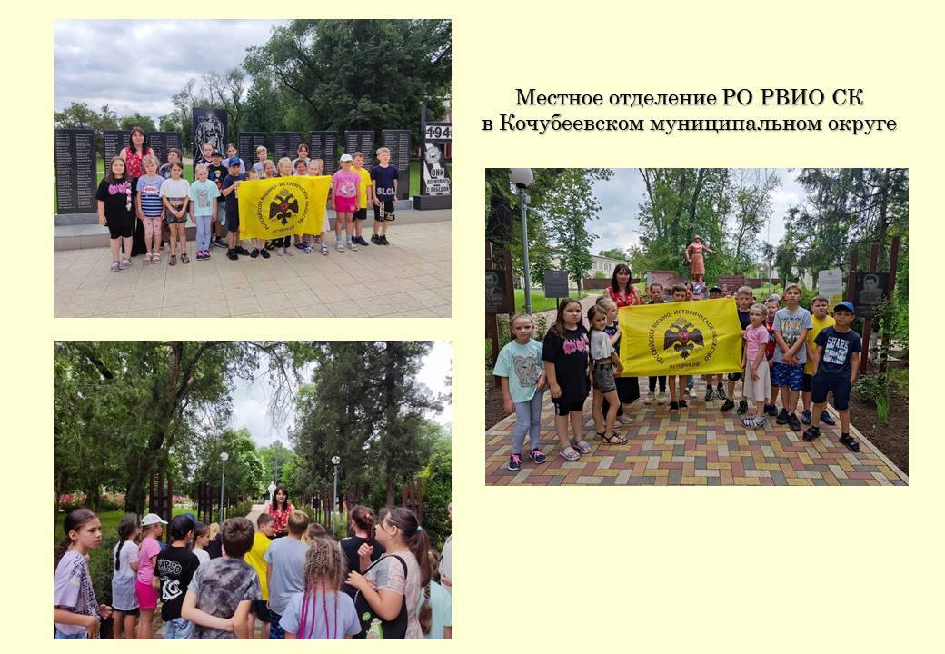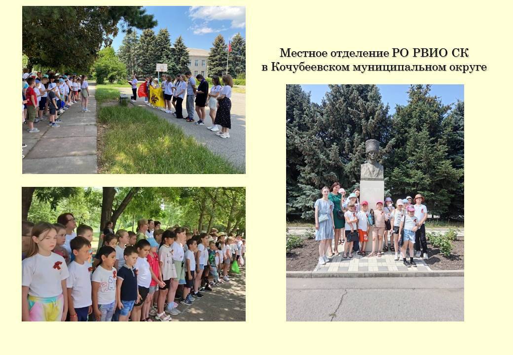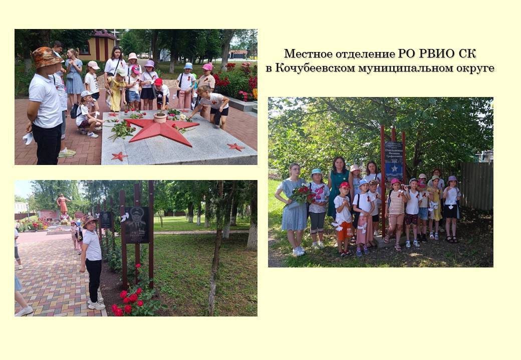 22 июня 2023 года представители МО РО РВИО СК в Кочубеевском муниципальном округе провели памятное мероприятие для воспитанников летнего лагеря «Солнышко» МКОУ СОШ №1 с. Кочубеевского. Ребятам рассказали о страшных событиях, развернувшихся в нашей стране в 1941 году, подарили памятные Георгиевские ленточки. Солопова Л.Н. провела для ребят экскурсию «Памятные места нашего села», особое внимание в которой было уделено событиям Великой Отечественной войны. Школьники присоединись к Всероссийской акции «Минута молчания». В завершении дня они смогли испытать свои физические и интеллектуальные силы в военно-патриотической игре «Зарница».
