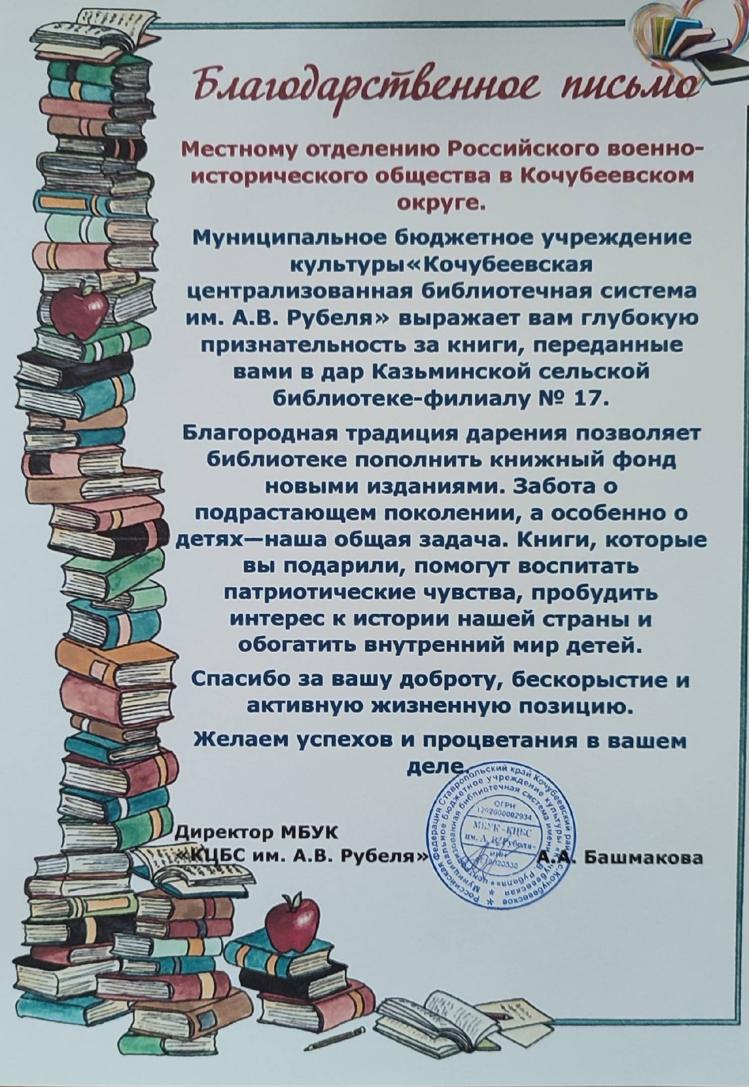 Сохранение памяти о событиях Великой Отечественной войны – одна из приоритетных задач РО РВИО СК. Одной из форм работы активистов Отделения в данном направлении является помощь в пополнении фондов сельских библиотек книгами о войне, для того чтобы даже в самых маленьких населенных пунктах у жителей была возможность глубже узнать о тех страшных событиях. В этом году представители МО РО РВИО СК в Кочубеевском муниципальном округе передали в дар Казьминской сельской библиотеки книги писателей-фронтовиков и свидетелей Великой Отечественной войны. Накануне Дня памяти и скорби председатель Местного отделения С.Н. Котов получил Благодарственное письмо от Кочубеевской централизованной библиотечной системы за оказанную поддержку и помощь в воспитании подрастающего поколения.