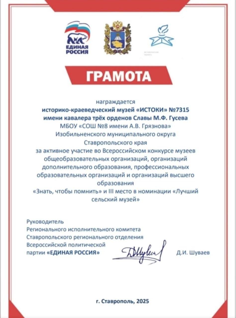18 мая 2025 г., в Международный день музеев, члены Местного отделения РО РВИО СК в Изобильненском муниципальном округе (председатель – Щендригин Н.И.) поздравили своих коллег. Особые слова благодарности прозвучали в адрес членов Отделения – Смирновой И.В., директора Музея истории Изобильненского района, и Мирошниченко Т.Н., руководителя Историко-краеведческого музея «Истоки» №7315 имени М.Ф. Гусева на базе МБОУ СОШ №8 им. А.В. Грязнова с. Тищенского (директор – Князева С.С., член РО РВИО СК). Недавно школьный музей стал призёром регионального этапа Всероссийского конкурса музеев общеобразовательных организаций и образовательных организаций высшего образования «Знать, чтобы помнить» в номинации «Лучший сельский музей».