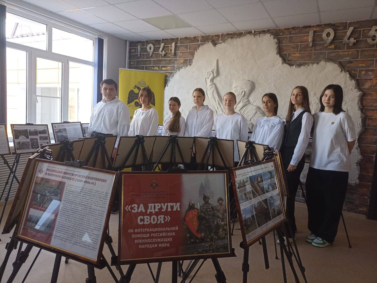 На базе МБОУ СОШ №28 г. Ставрополя продолжается работа выставочного проекта «За други своя» РО РВИО СК, презентация которого состоялась 26 сентября 2024 г. Учащиеся школы знакомятся с историей миротворческой деятельности России в формате передвижной выставки, подготовленной в рамках проекта «Воспитание историей» при поддержке Министерства молодёжной политики Ставропольского края.