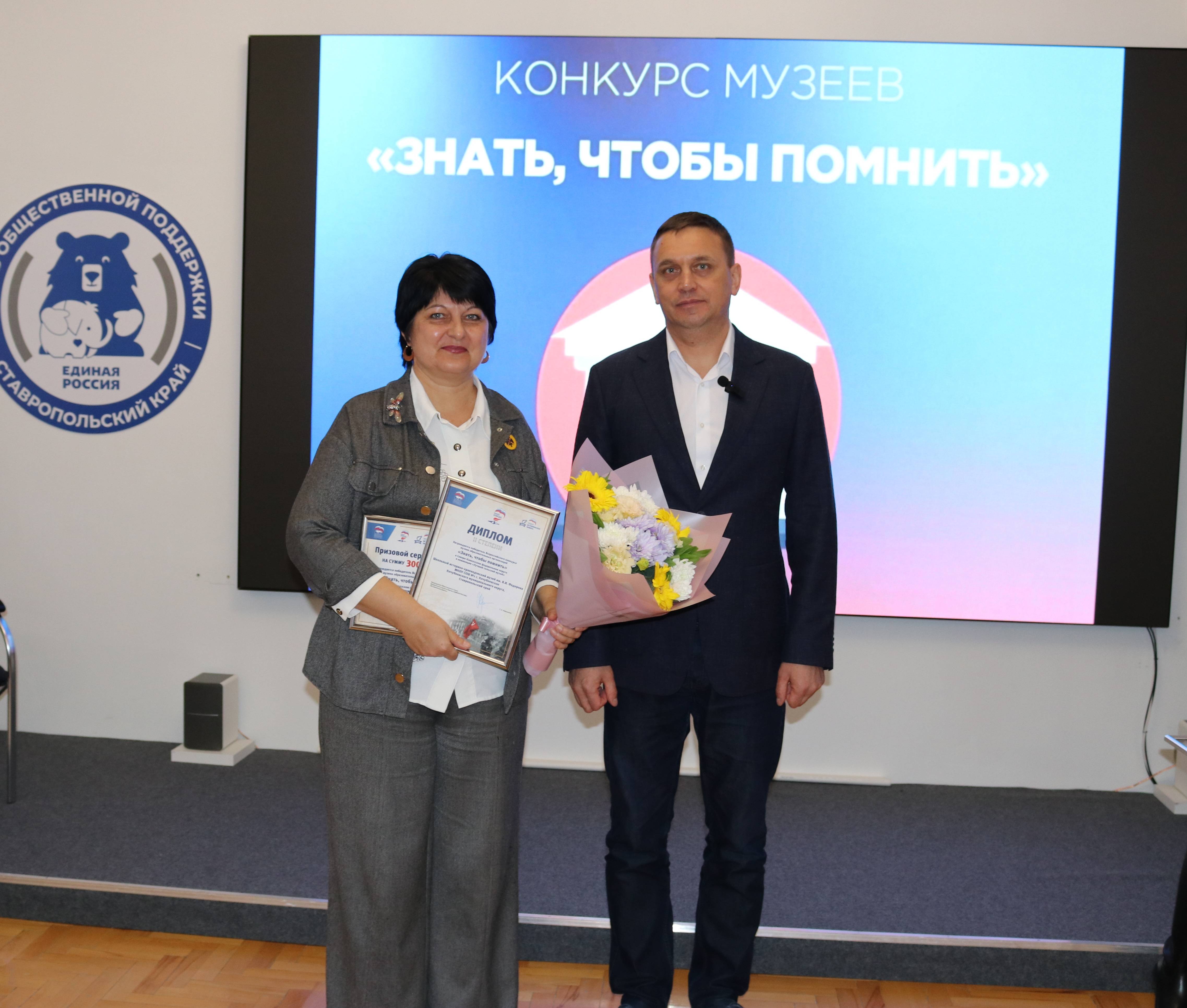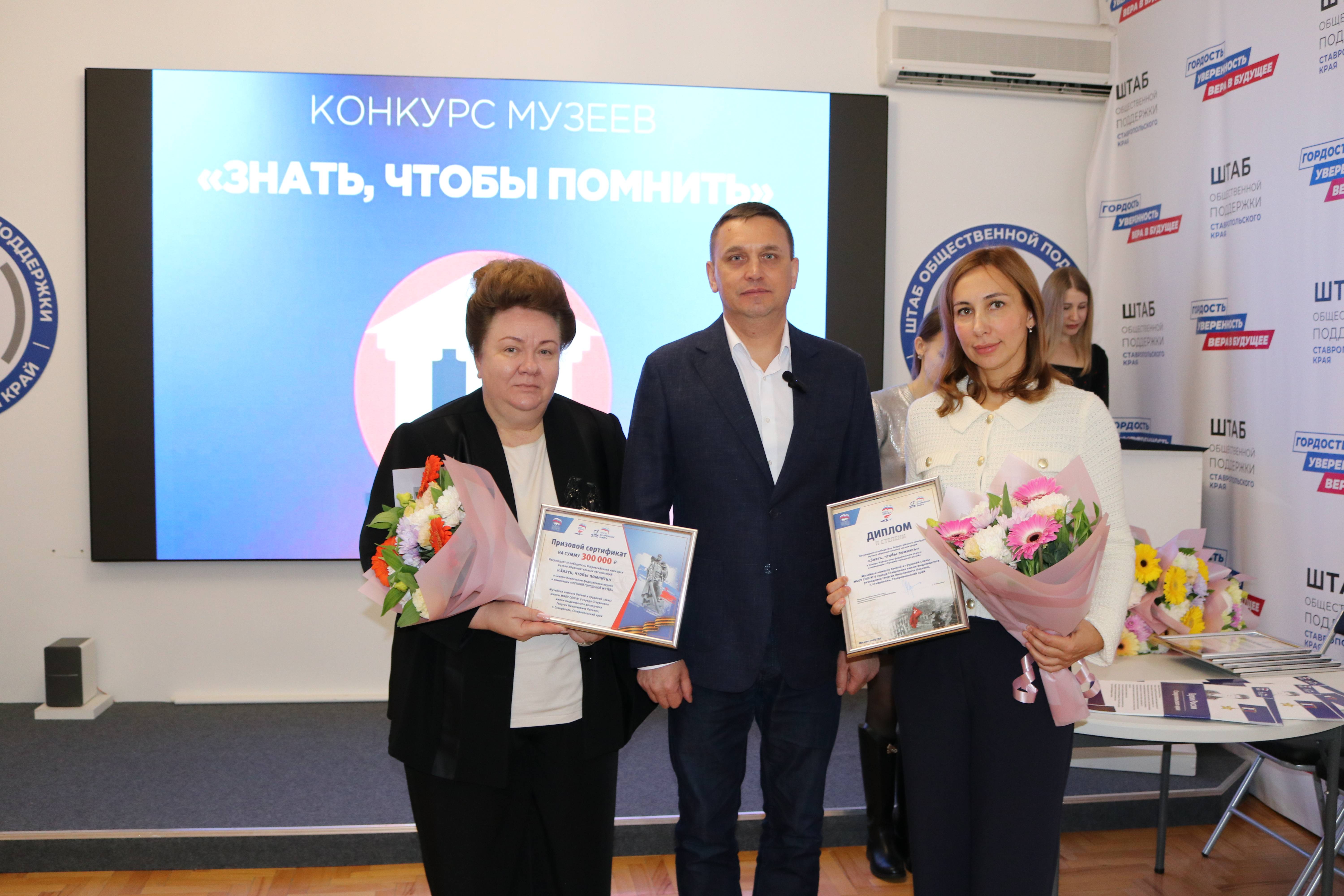 11 ноября 2025 года на базе Штаба общественной поддержки Ставропольского края состоялась торжественная церемония награждения победителей конкурса музеев «Знать, чтобы помнить». За 2 место в номинации «Лучший городской музей» награда вручена Музейной комнате боевой и трудовой славы СОШ №6 г. Ставрополя имени выдающегося разведчика Георгия Николаевича Косенко в лице директора школы С.Г. Шутовой и руководителя музея, члена РО РВИО СК А.Б. Анисимовой. За 2 место в номинации «Лучший сельский музей» награждён Школьный историко-краеведческий музей имени В.И. Фёдорова МКОУ СОШ №1 с. Кочубеевского в лице руководителя музея, члена РО РВИО СК Е.А. Щекиной. Школы, занявшие вторые места, вместе с дипломами получили сертификаты номиналом в 300 тысяч рублей на развитие музейной деятельности и набор карточек с информацией о ставропольцах – Героях РФ.