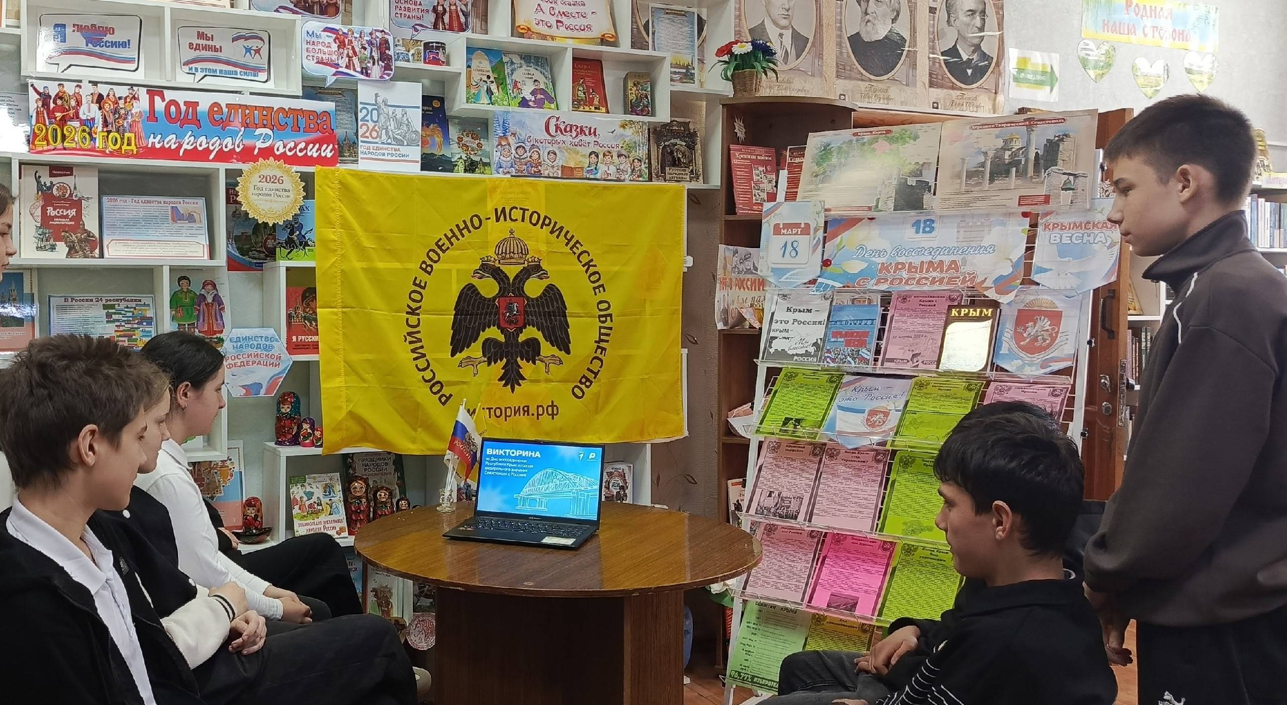 16 марта 2026 г. для учащихся МКОУ СОШ №5 с. Сергиевского Грачёвского муниципального округа (директор – Гоноченко О.А., РО РВИО СК) на базе Сергиевской сельской библиотеки (библиотекарь – Жалыбина Г.М., член РО РВИО СК) была организована тематическая викторина, направленная на изучение истории, культуры и географии Крымского полуострова. Интеллектуальное состязание показало, что ребята не только знают основные исторические даты, но и искренне интересуются судьбой своей Родины.