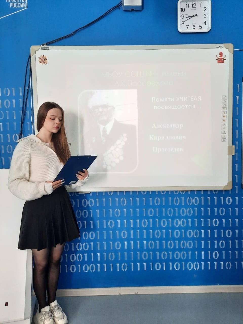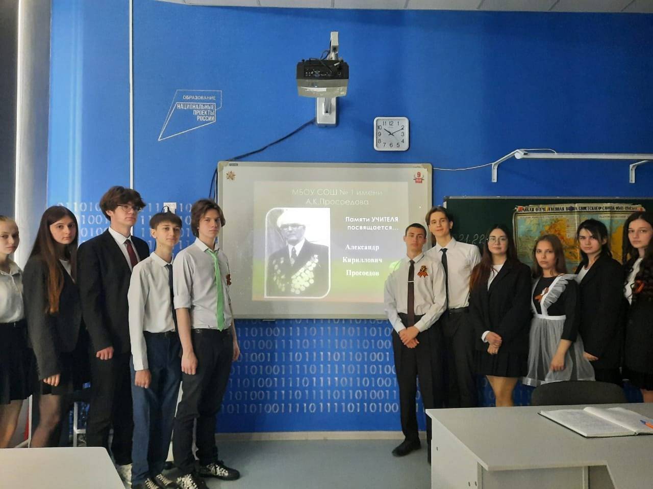 Также ежегодно 23 апреля в МБОУ СОШ №1 им. А.К. Просоедова г. Георгиевска проходит День памяти бывшего директора школы – Александра Кирилловича Просоедова, заслуженного учителя РСФСР, участника Великой Отечественной войны. Он был достойным примером настоящего педагога – справедливым, честным, требовательным. День памяти приурочен ко Дню его рождения. Руководитель школьного музея Рогова Т.А., учитель истории и обществознания, член Местного отделения РО РВИО СК в Георгиевском муниципальном округе (председатель – Алексина Е.Ю.) провела для старшеклассников урок, посвящённый выдающемуся земляку.