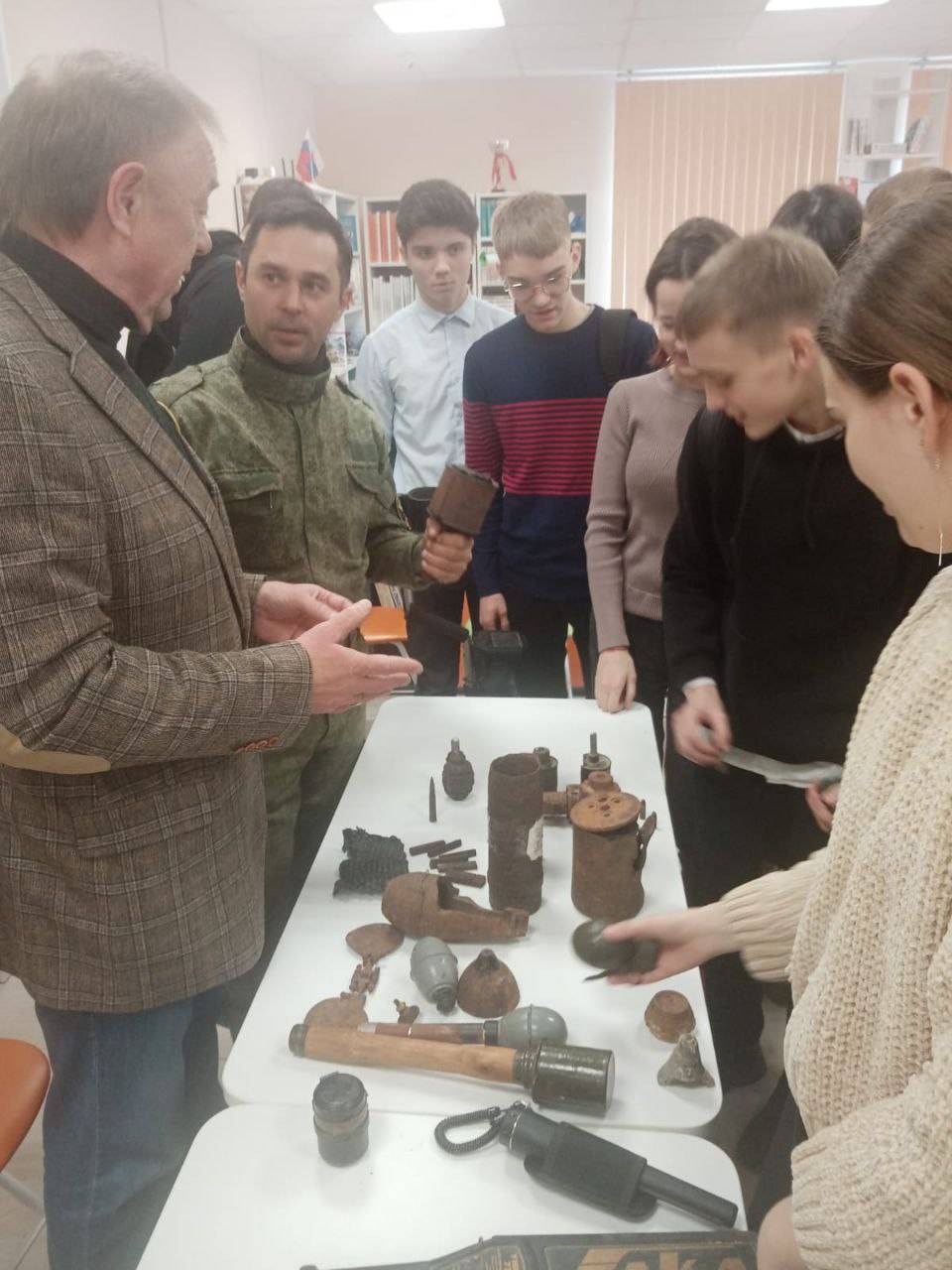 Внимание школьников привлекли артефакты, найденные на местах сражений, которые продемонстрировал А.М. Пханеев. Они вели оживленную беседу, задавали вопросы членам РО РВИО СК.