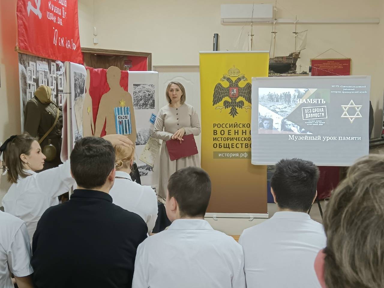 28 января 2026 г. в Новоалександровском районном музее для девятиклассников МКОУ СОШ №12 прошёл музейный урок «Холокост: память без срока давности». Мероприятие организовали Герасимова М.Ф. и Скрипникова Л.А., члены РО РВИО СК. Основой урока стали не только общие исторические факты, но и локальные архивные документы. Учащимся представили «Акт о фашистских злодеяниях», в котором зафиксированы расстрелы мирных жителей и уничтожение еврейского населения на территории района в период оккупации. Особое впечатление произвели видеовоспоминания узников лагерей и солдат-освободителей, а также личная история семьи Вайсберг, чья судьба положила начало изучению темы Холокоста в Новоалександровском районе. Встреча заставила подростков задуматься о важности сохранения памяти и недопущения подобных преступлений в будущем.