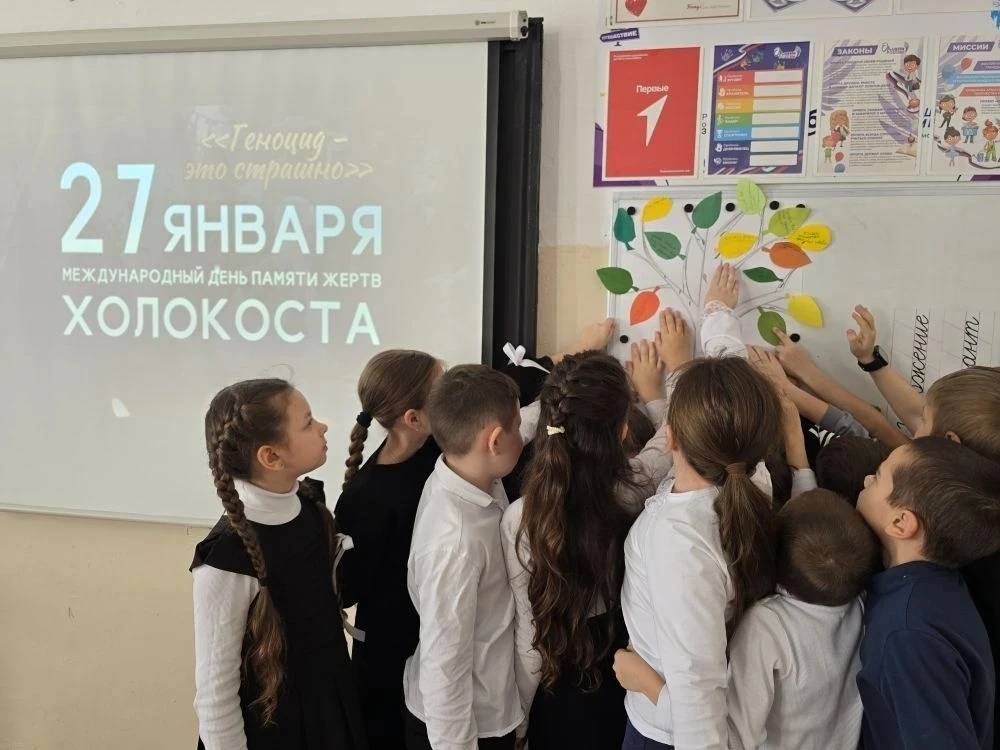 27 января 2026 г. учащиеся Беломечётской школы (директор – Волосовцева Е.А., член Местного отделения РО РВИО СК в Кочубеевском муниципальном округе (председатель – Котов С.Н.)) почтили память жертв Холокоста. 27 января 1945 г. советские войска освободили концлагерь Освенцим. Эта трагическая страница истории унесла жизни от 1,5 до 4 миллионов человек. В память об этом событии и в честь подвига наших солдат, освободивших лагерь, учащиеся 2 класса приняли участие в акции «Дерево доброты». На красочных листочках ребята написали искренние пожелания мира и добра, превратив обычный ватман в символ надежды и света. В завершение встречи школьники вместе обсудили важную тему: «Как мы можем делать мир добрее?». Такие мероприятия помогают сохранить память о трагических событиях прошлого и воспитать в детях ценности доброты, милосердия и взаимопомощи.