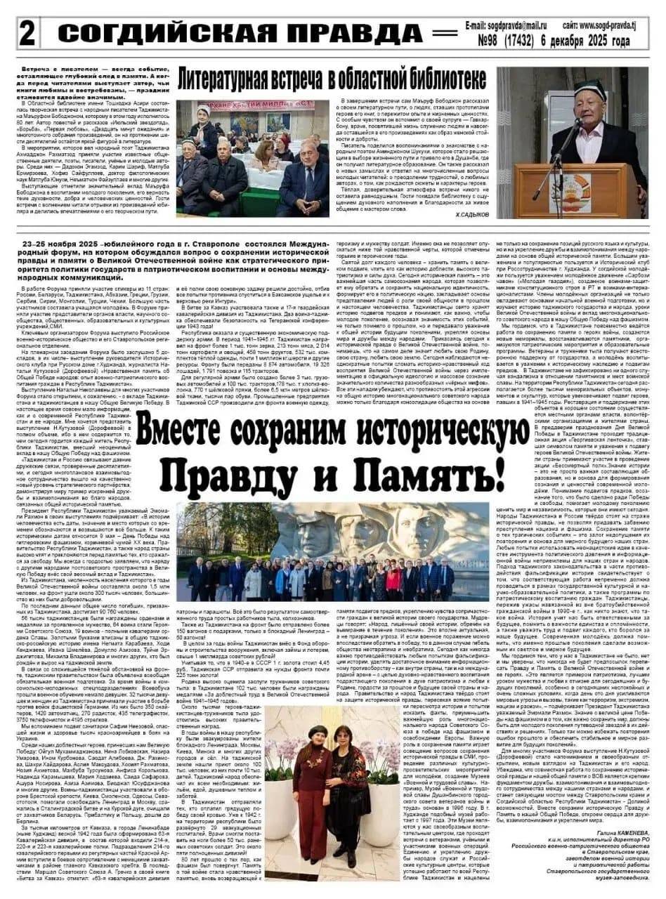 Тема сохранения исторической правды находит отклик и за рубежом. В выпуске газеты «Согдийская правда» (Республика Таджикистан) от 6 декабря 2025 г. была опубликована статья Каменевой Г.Н. «Вместе сохраним историческую Правду и Память!». Публикация стала продолжением диалога, начатого на Международном форуме «Сохранение исторической памяти как стратегический приоритет политики России и основа международных коммуникаций» (г. Ставрополь, 23-25 ноября 2025 г.), где журналист Дорофеева Н.Н., руководитель Исторического клуба при Русском доме г. Худжанда, подняла вопрос о вкладе таджикистанцев в общую Победу советского народа в Великой Отечественной войне.