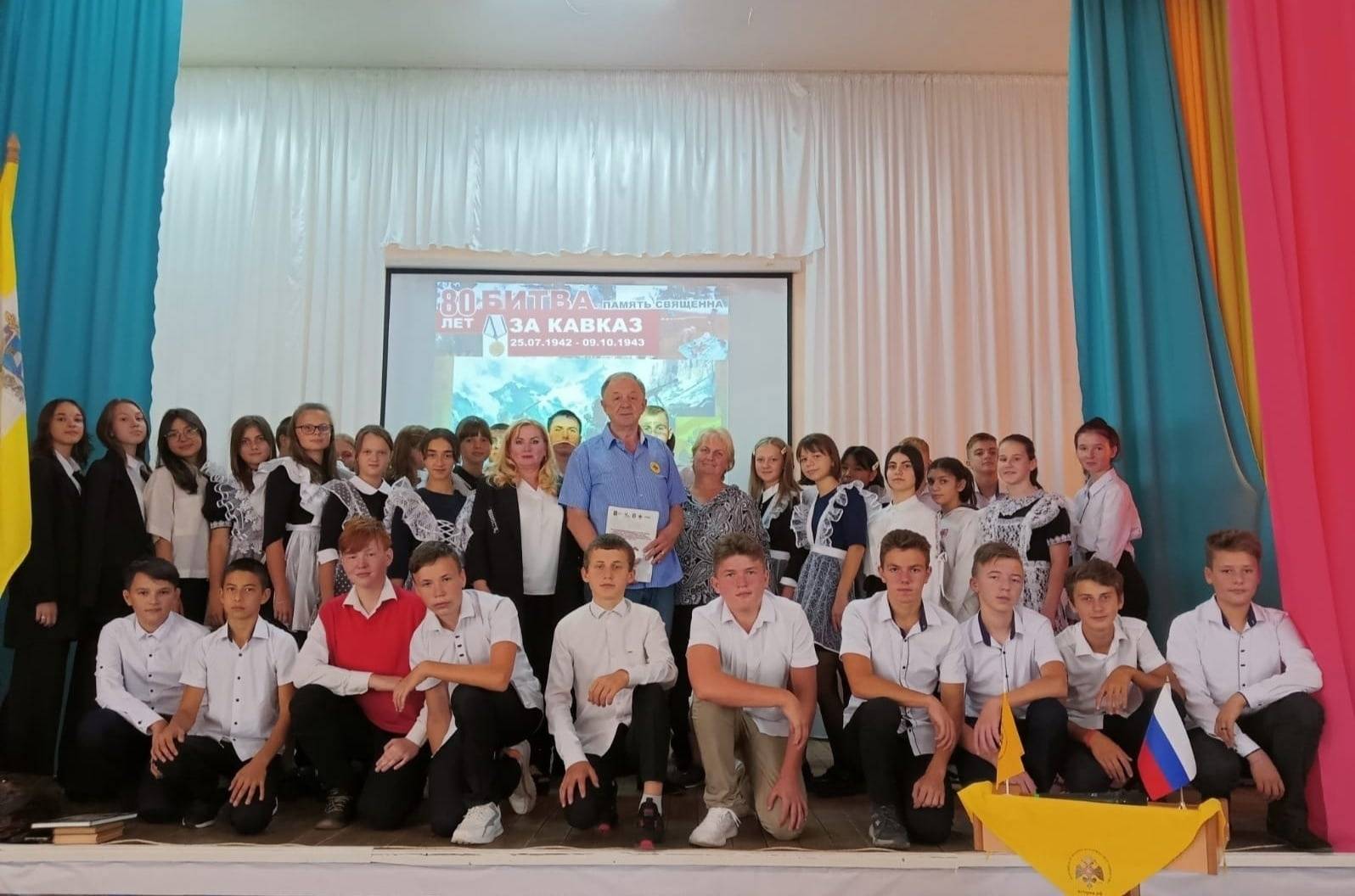 Отдельная страница разговора была посвящена Битве за Кавказ – одной из самых продолжительных и кровопролитных битв Великой Отечественной войны. Щендригин Н.И. рассказал о событиях, произошедших 80 лет назад, о значимости этой битвы в победе СССР над фашистскими захватчиками, об уроженцах Изобильненского городского округа – участниках Битвы за Кавказ. Он обратил внимание учащихся на учащающиеся попытки фальсифицировать события той войны, принизить роль советского народа в Великой Победе, призвал школьников критически относиться к получаемой информации, хранить память о совершенном подвиге ради нашего мирного неба.